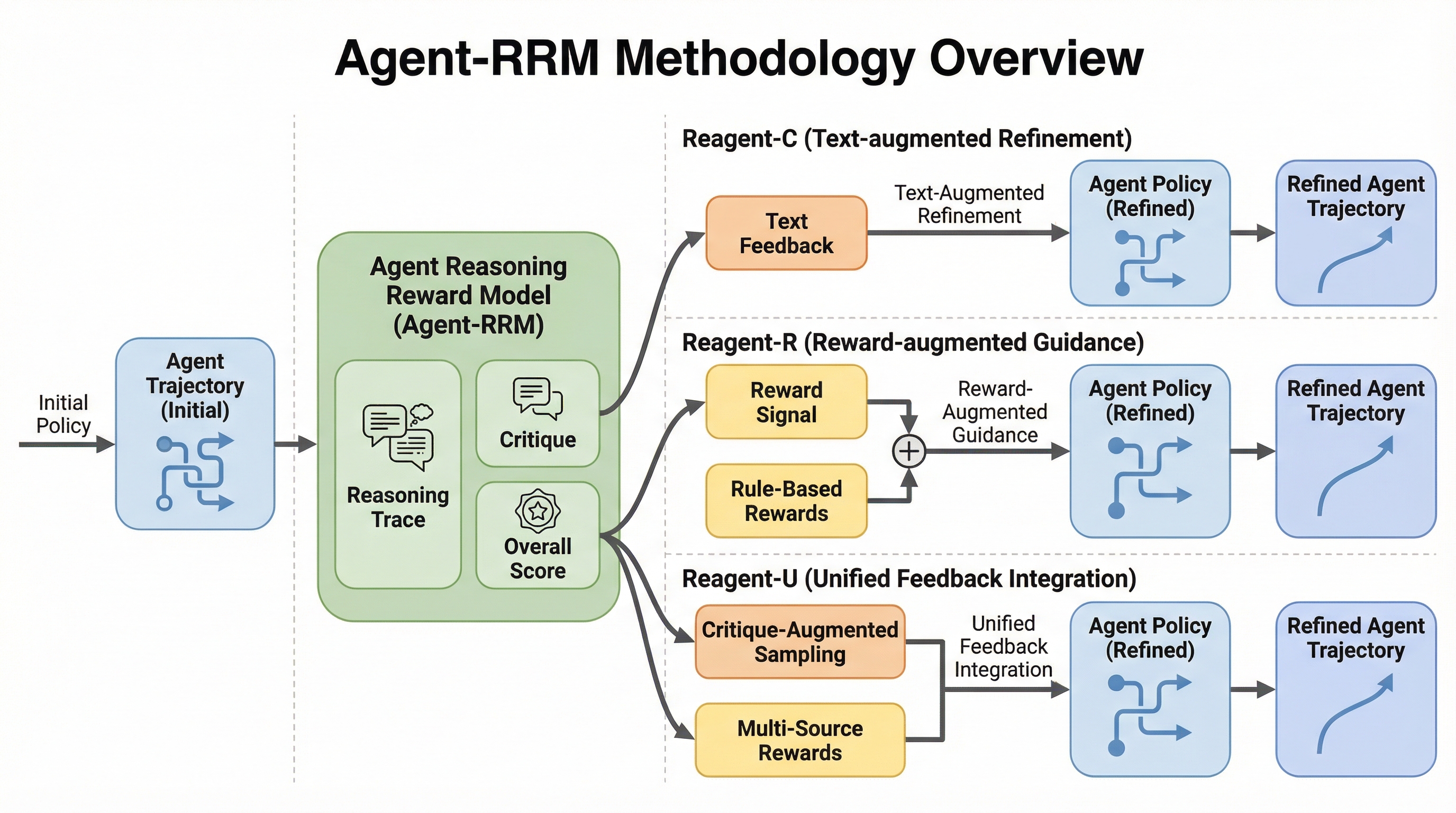 本研究の核心は、エージェントの軌跡に対して構造化されたフィードバックを生成する多面的な評価モデル「Agent-RRM(Agent Reasoning Reward Model)」の提案です。このモデルは、従来の報酬モデルのように単一のスカラー値を出力するのではなく、以下の3つのコンポーネントからなる詳細な判断を下します。第一に、軌跡の論理的な一貫性を分析する内部推論トレース(think)です。第二に、推論や実行における具体的な欠陥を特定し、洗練のためのガイダンスを提供する標的型批判(critique)です。第三に、プロセスのパフォーマンスを総合的に評価する全体的な品質スコア(score)です。これにより、グローバルな最適化のためのスカラー報酬と、明示的なエラー修正のためのテキスト批判を組み合わせた、透明性の高い粒度の細かい評価が可能になります。…