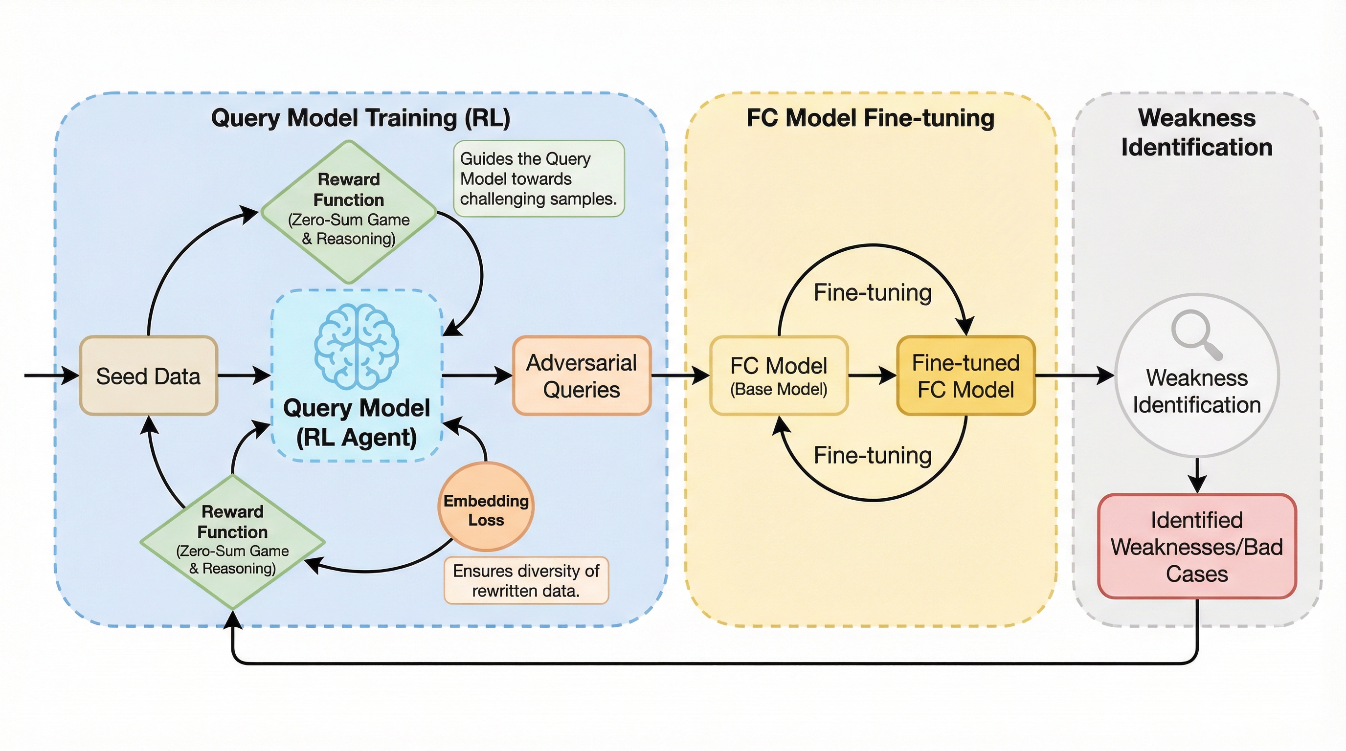 大規模言語モデル(LLM)の関数呼び出し能力を向上させるため、強化学習を用いてモデルの弱点を能動的に探索し、敵対的なクエリを生成する新しいデータ拡張フレームワークを提案しました。 この手法は、クエリを生成する「クエリモデル」と、それに応答する「関数呼び出しモデル」を零和ゲームの枠組みで交互に反復学習させることで、従来の固定的なデータセットでは到達できなかった複雑な失敗パターンを体系的に特定します。 検証の結果、提案手法はモデルの堅牢性と汎用性を大幅に向上させ、外部ツールやAPIとの対話において、より正確で信頼性の高い構造化データの出力を可能にすることが確認されました。
