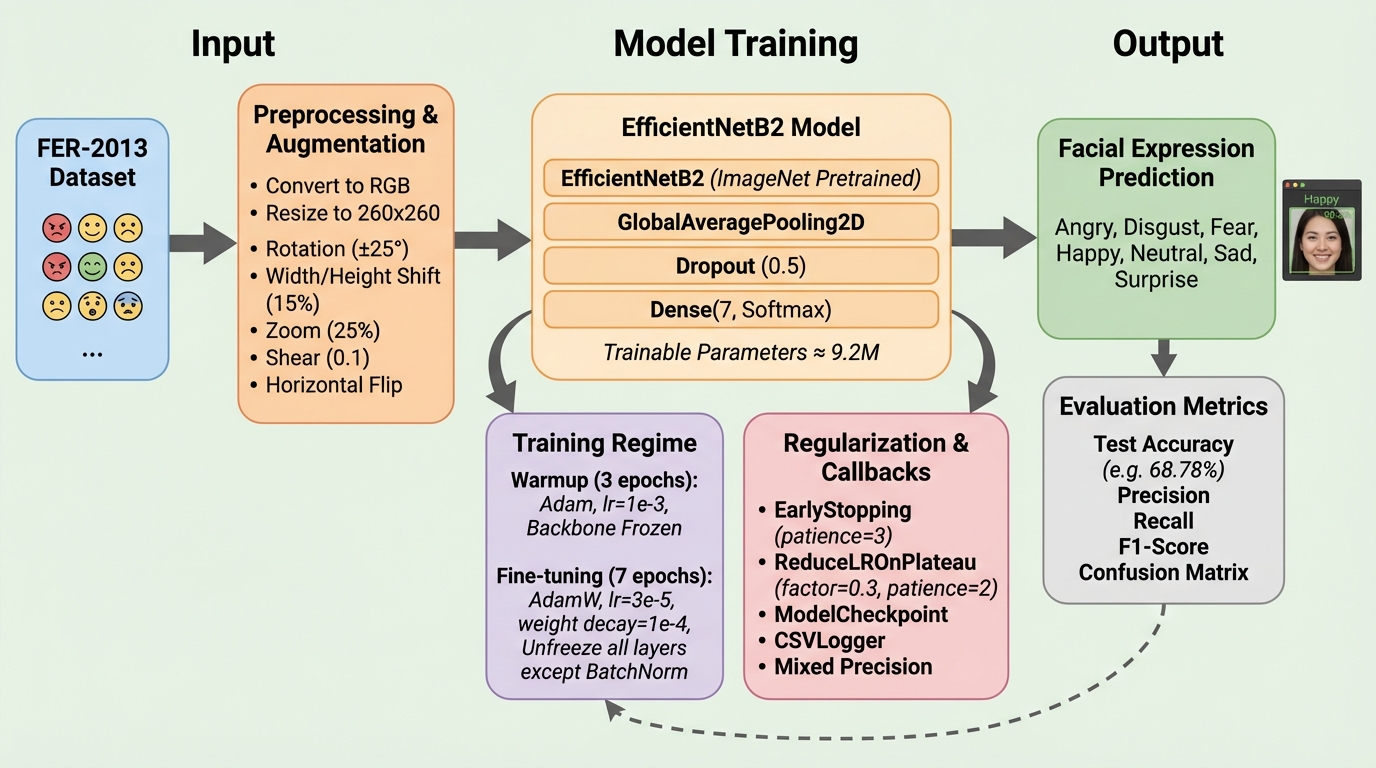 本研究では、計算資源が限られた環境でも動作可能な顔の表情認識システムを実現するため、EfficientNetB2を基盤とした軽量なモデル構成を提案し、難易度の高いFER-2013データセットを用いてその有効性を検証しました。
