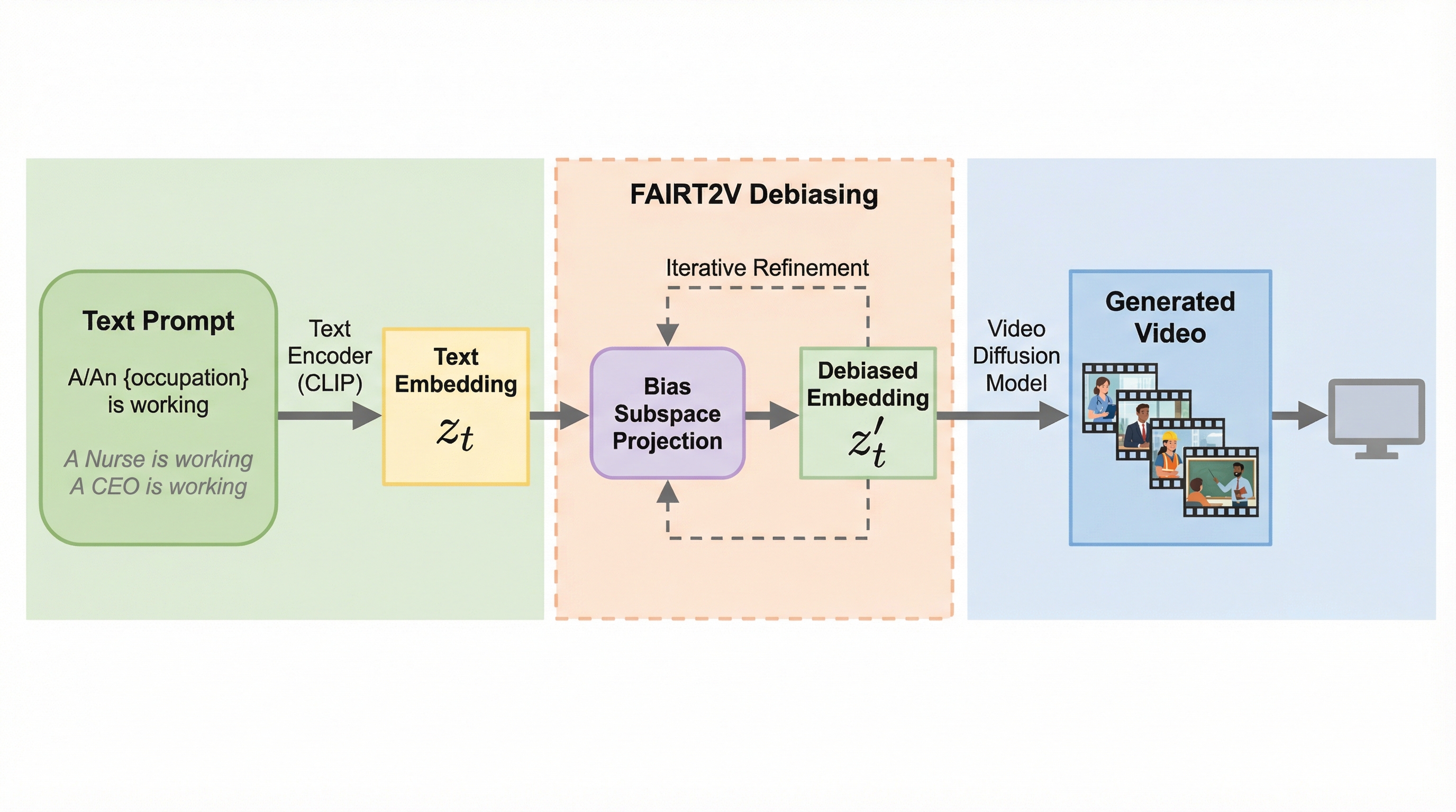 本論文では、テキストから動画を生成する拡散モデルにおける人口統計学的バイアスの最初の体系的な研究として、FAIRT2Vという学習不要のデバイアスフレームワークを提案しています。この研究の核心は、バイアスの主な原因が、生成モデルそのものではなく、条件付けに使用される事前学習済みのテキストエンコーダー(CLIPやT5など)にあることを突き止めた点にあります。これらのエンコーダーは、中立的なプロンプトに対しても、潜在的な性別の関連付けをエンコードしてしまっていることが判明しました。 この洞察に基づき、FAIRT2Vはテキストエンコーダーによって引き起こされるバイアスを、モデルの微調整を行うことなく、プロンプトの埋め込みレベルで中立化します。…