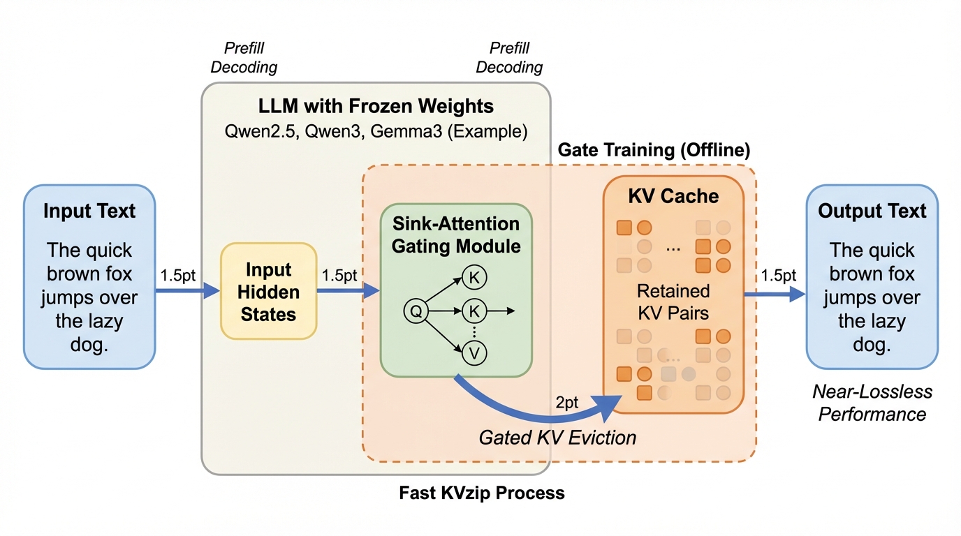 大規模言語モデル(LLM)の推論において、文脈長に比例して増大するKVキャッシュのメモリ消費を劇的に抑えるため、軽量なゲート機構を用いて不要な情報を動的に排除する新手法「Fast KVzip」が提案されました。この手法は、モデルの重みを固定したまま、入力の隠れ状態から各KVペアの将来的な重要度を予測する「シンクアテンション型ゲート」を学習することで、最大70%のキャッシュを削減しながらも、ほぼ損失のない精度を維持することに成功しています。Qwen2.5やQwen3、Gemma3といった最新のモデル群を用いた検証により、17万トークンに及ぶ長文脈理解や数学的推論、コード解析などの多様なタスクにおいて、計算コストを最小限に抑えつつ、推論時のピークメモリとプレフィル時間を大幅に削減できることが実証されました。