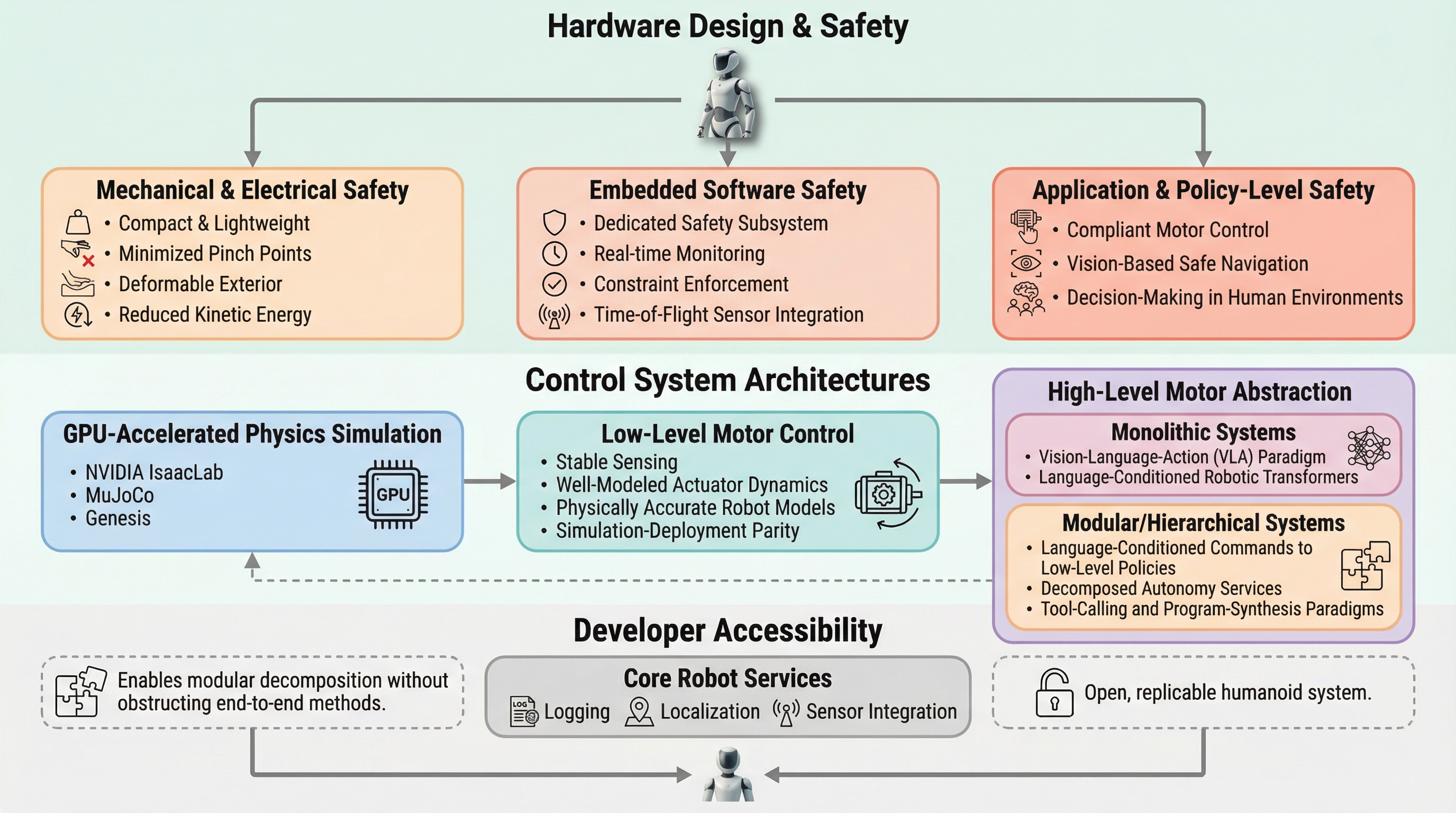 本プロジェクトでは、安全性、表現力、および開発者のアクセシビリティという三つの柱に重点を置いた、次世代の開発者向けプラットフォーム「Sprout」を提案している。Sproutは、人間との近接した環境での運用を前提にゼロから設計されており、1.07メートルという親しみやすい身長と22.7キログラムという軽量なフォームファクタを採用している。このサイズ感は、ロボットが持つ運動エネルギーを物理的に抑制し、万が一の衝突時における潜在的な衝撃力を大幅に低減させるという、安全性における極めて重要な役割を果たしている。…