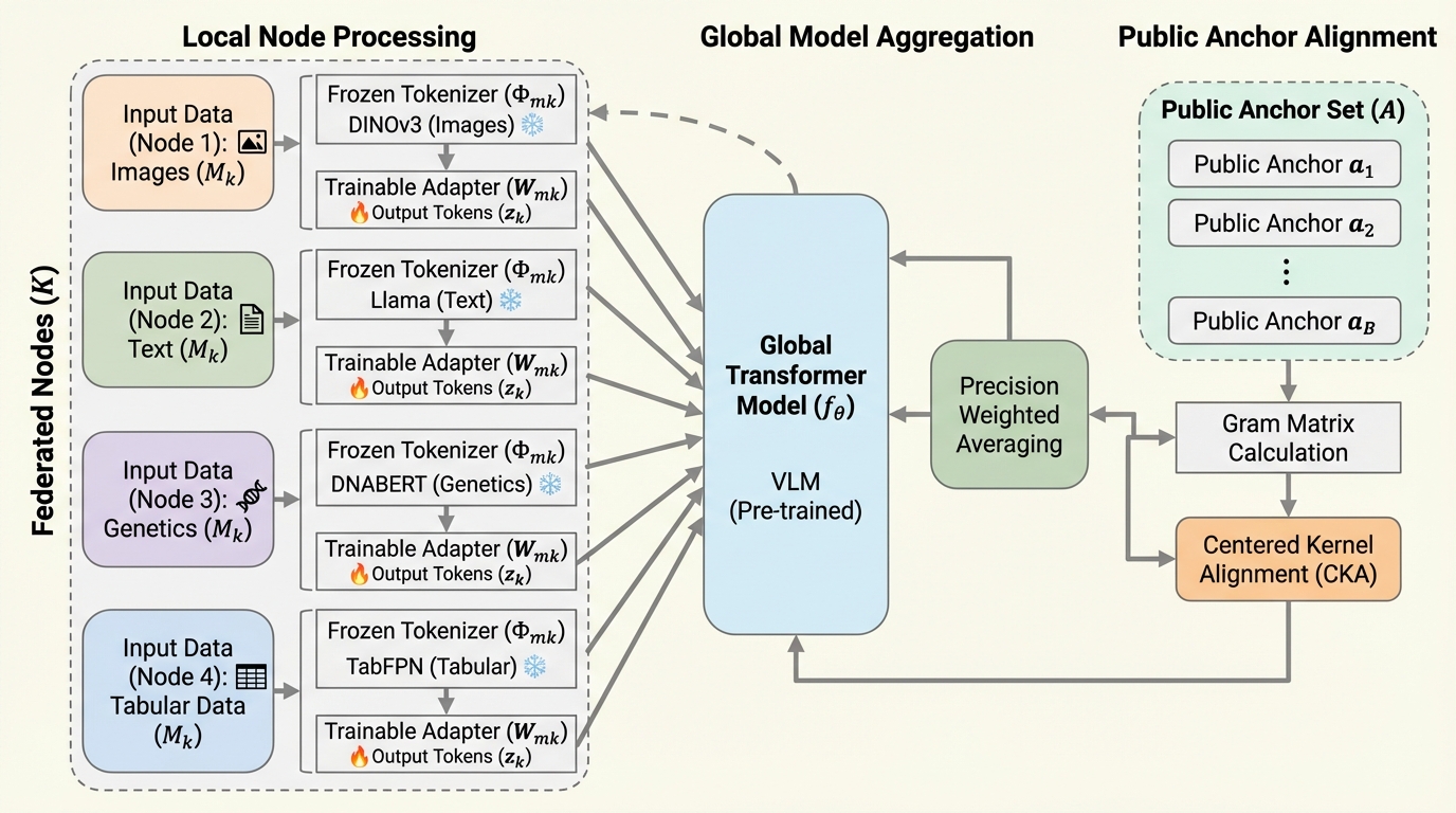 従来のマルチモーダル学習は画像とテキストのペアが揃った大規模な中央集権的データを必要としていましたが、医療や金融などの機密分野ではデータが分散し、かつペアが存在しない「ペアなしデータ」の状態が一般的であるという課題がありました。本研究では、異なるモダリティを共通のトークン形式に変換して単一のTransformerモデルに投入する均質なフレームワークを提案し、データの断片化という問題を根本から解決することを目指しています。 プライバシーを保護しつつ異なる拠点間のデータを整列させるため、少数の公開アンカーセットを利用してデータの幾何学的構造を同期させる手法を導入しており、生のデータや特徴量を共有することなく、数学的に強固なプライバシー保証を実現しています。具体的には、中心化カーネル整列(CKA)とグラム行列を用いることで、各拠点のローカルな多様体をグローバルなコンセンサスに適合させ、異なる種類のデータ間での意味的な整合性を確保することに成功しています。 さらに、通信効率を劇的に向上させるための低ランク近似(LoRA)を拡張したGeoLoRAや、データの不確実性を考慮した精度加重平均プロトコルを提案することで、巨大な基盤モデルを効率的かつ堅牢に連合学習させる仕組みを構築しました。