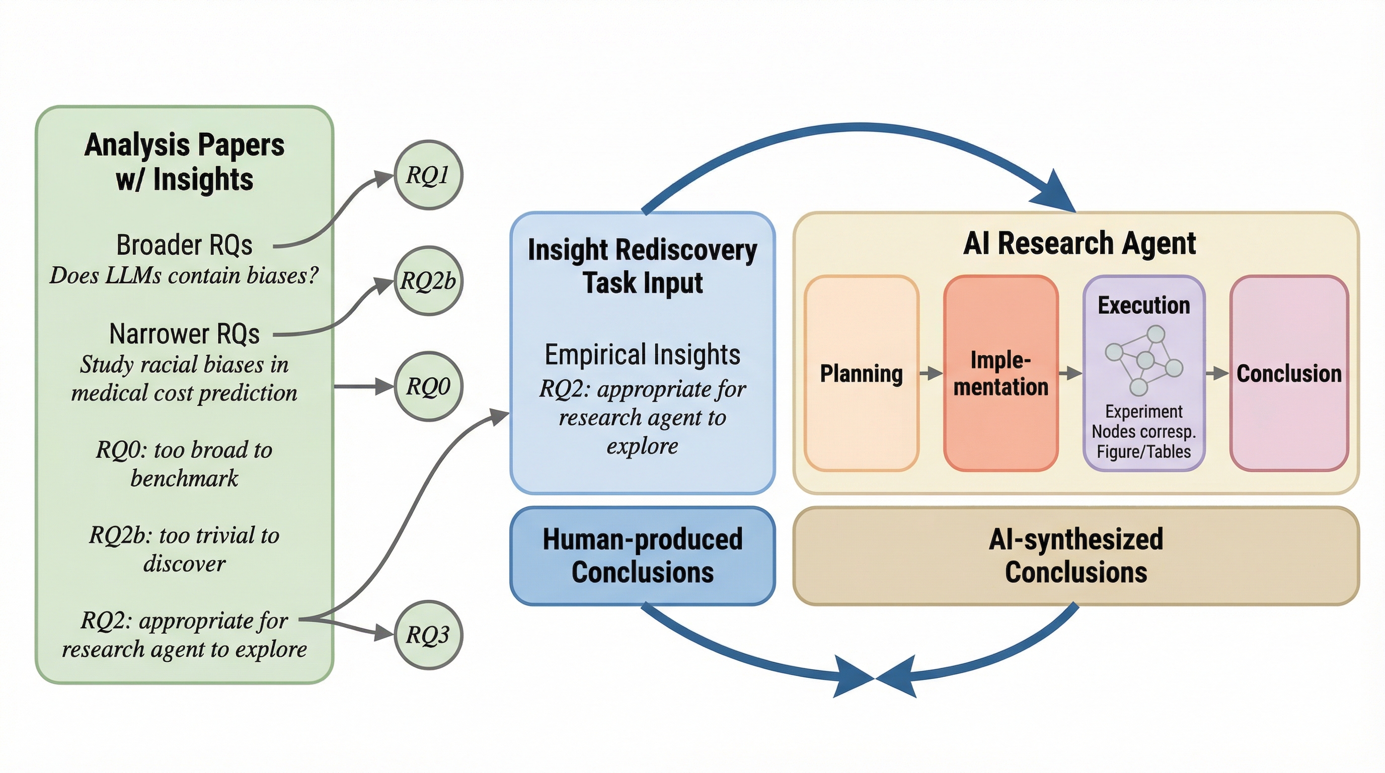 大規模言語モデル(LLM)を基盤とした自律型エージェントは、科学的な発見のプロセスをエンドツーエンドで加速させる可能性を秘めています。これらの「AI研究者」は、文献の合成、仮説の生成、コーディング、実験の実施、そしてデータ分析といった、研究ライフサイクルの個別の段階を自動化する能力を日々向上させています。しかし、これらのエージェントが真に検証可能な科学的発見を行う能力を持っているかどうかを、厳密かつ大規模に評価することは依然として中心的な課題となっています。既存の評価ベンチマークには、主に2つの大きなトレードオフが存在しており、評価の信頼性や範囲に限界がありました。 一つ目のパラダイムは、エージェントに完全な研究論文を作成させ、その出力をLLMを審判員として評価させる手法ですが、これは専門家による評価の代用としては不十分な場合があります。LLMによる評価は、科学的な妥当性よりも文章の流暢さや形式に左右されるリスクがあり、大規模な検証において信頼性を担保することが困難です。二つ目のパラダイムは、リーダーボード上でのモデルの精度向上など、単一の性能指標に焦点を当てた機械学習タスクに限定する手法です。…