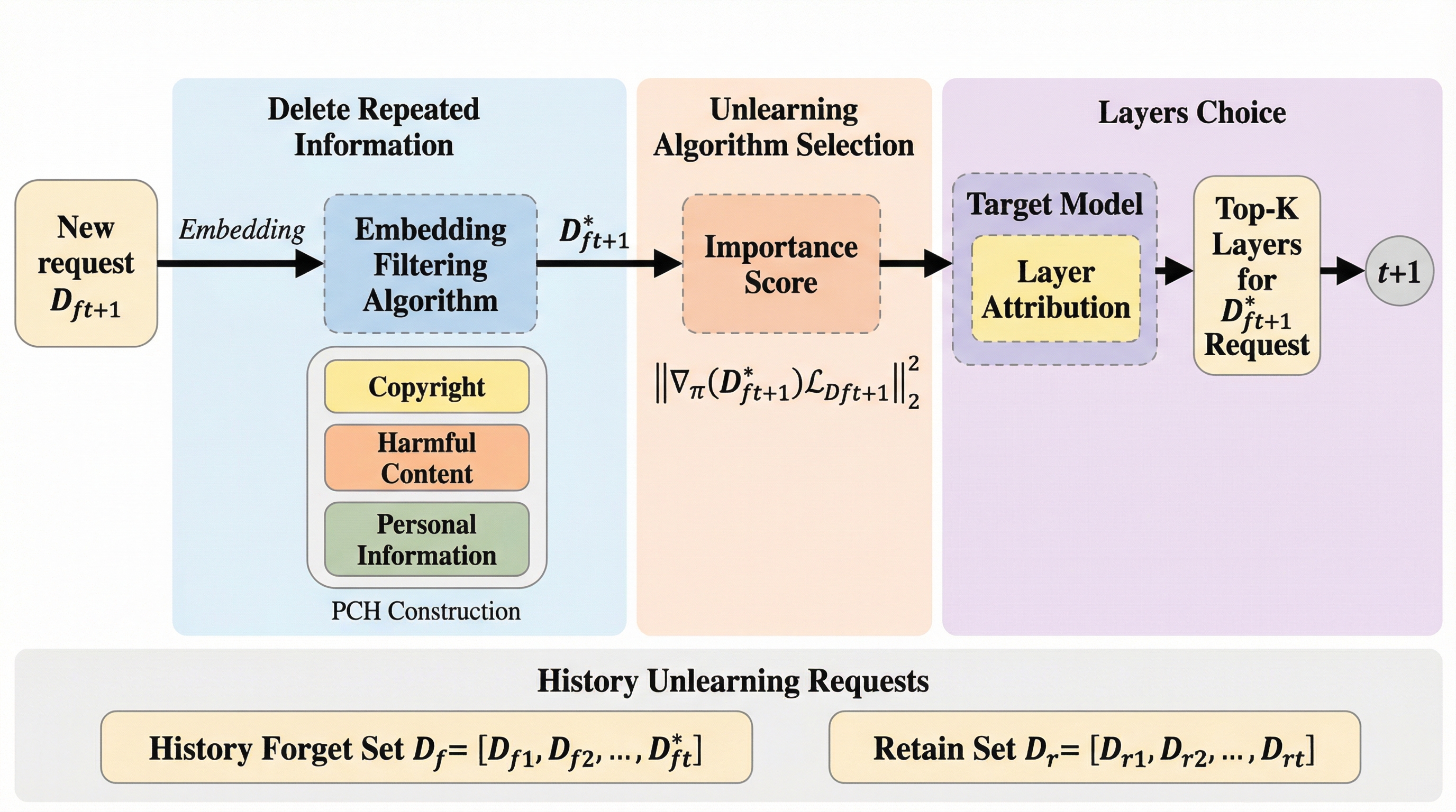 本研究では、継続的なアンラーニングにおけるモデルの崩壊を防ぎ、長期的な安定性を確保するためのフレームワーク「FIT」を提案している。FITという名称は、その中核をなす3つの主要コンポーネントである「フィルタリング(Filtering)」、「重要度を考慮した更新(Importance-aware updates)」、「ターゲットを絞った層の特定(Targeted layer attribution)」の頭文字に由来している。このフレームワークは、削除要求が次々と届く状況下で、モデルのパラメータが過度に変動することを抑制し、必要な情報だけを精密に削ぎ落とすことを目的としている。 第一の柱である「フィルタリング」では、意味的に重複する削除要求を事前に排除する。これにより、似たような勾配更新が何度も繰り返されることで生じる、特定の語彙や概念に対する過剰な抑制を防ぐ。…