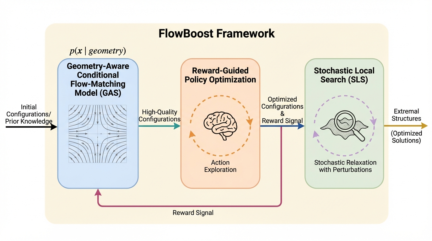 数学の極値幾何学における構造発見において、従来の離散的な手法や大規模言語モデル(LLM)に依存する手法の限界を打破するため、連続的な空間で直接動作する新しい生成フレームワークであるFlowBoostを提案しました。