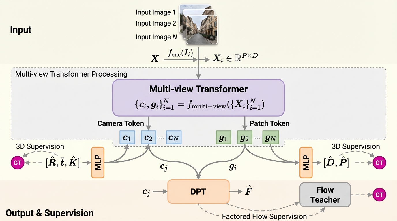 Flow3rが提案する中心は、視覚幾何モデルの学習を「フローの予測」で強く導くために、フロー予測モジュールを因子分解し、非対称な情報の組み合わせとして定義する点です。具体的には、2枚の画像の間のフローを推定するとき、片方の画像から得た幾何に対応する潜在表現を「ソース側」として使い、もう片方の画像から得たカメラ姿勢に対応する潜在表現を「ターゲット側」として使います。これにより、フローという2Dの教師信号が、シーン幾何とカメラ運動の両方に同時に働くように設計されています。 この着想は、本文抜粋で説明されている射影幾何の見方とも整合します。静的シーンであれば、ソース画像で推定した点群表現(点マップ)とターゲット画像のカメラパラメータを用いて、投影によって対応点(すなわちフロー)を計算できるため、フローは「ソースの幾何」と「ターゲットの姿勢」によって誘導されると捉えられます。…