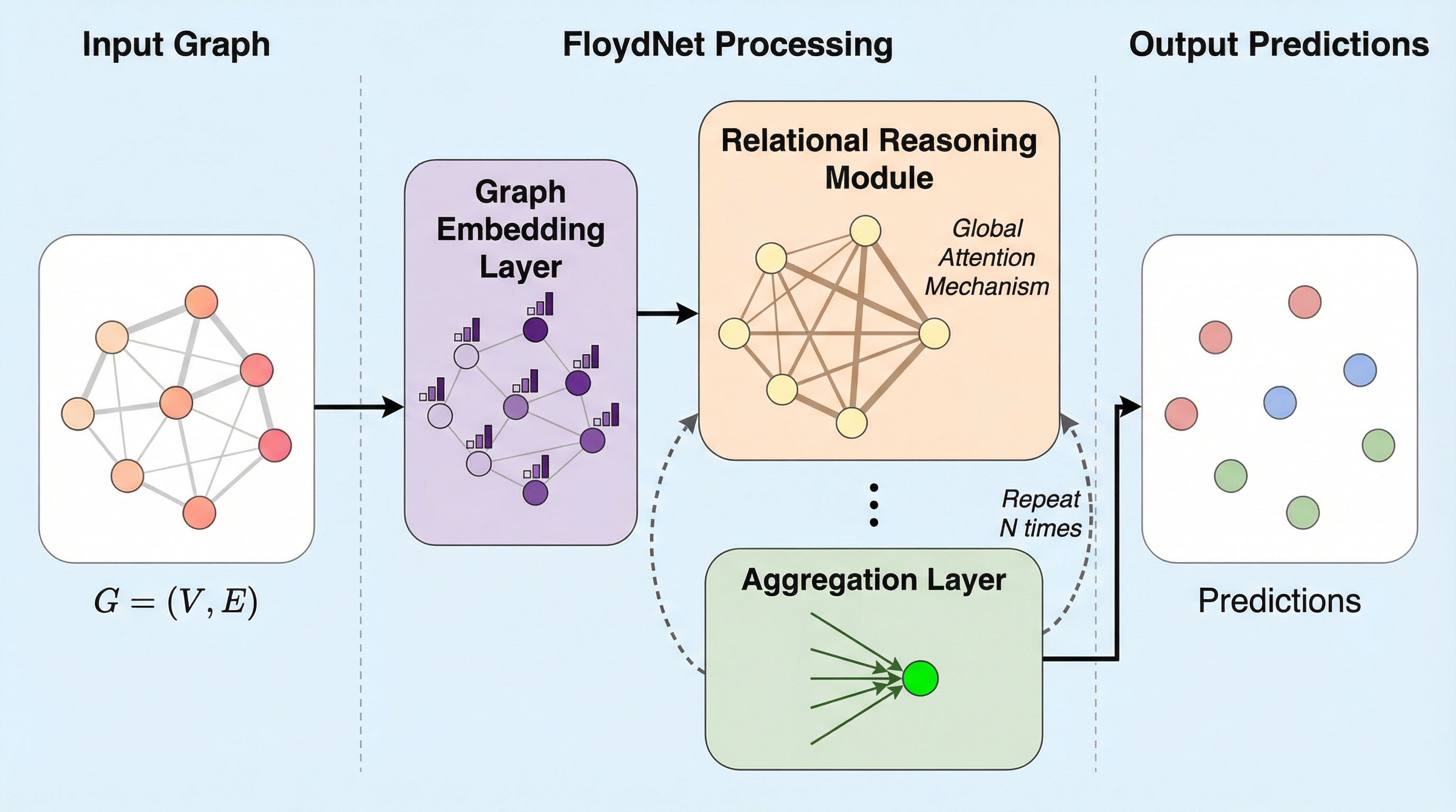 従来のグラフニューラルネットワーク(GNN)が抱えていた局所的なメッセージパッシングによる情報のボトルネックや表現力の限界を打破するため、動的計画法の原理を取り入れた新しいアーキテクチャ「FloydNet」が提案されました。