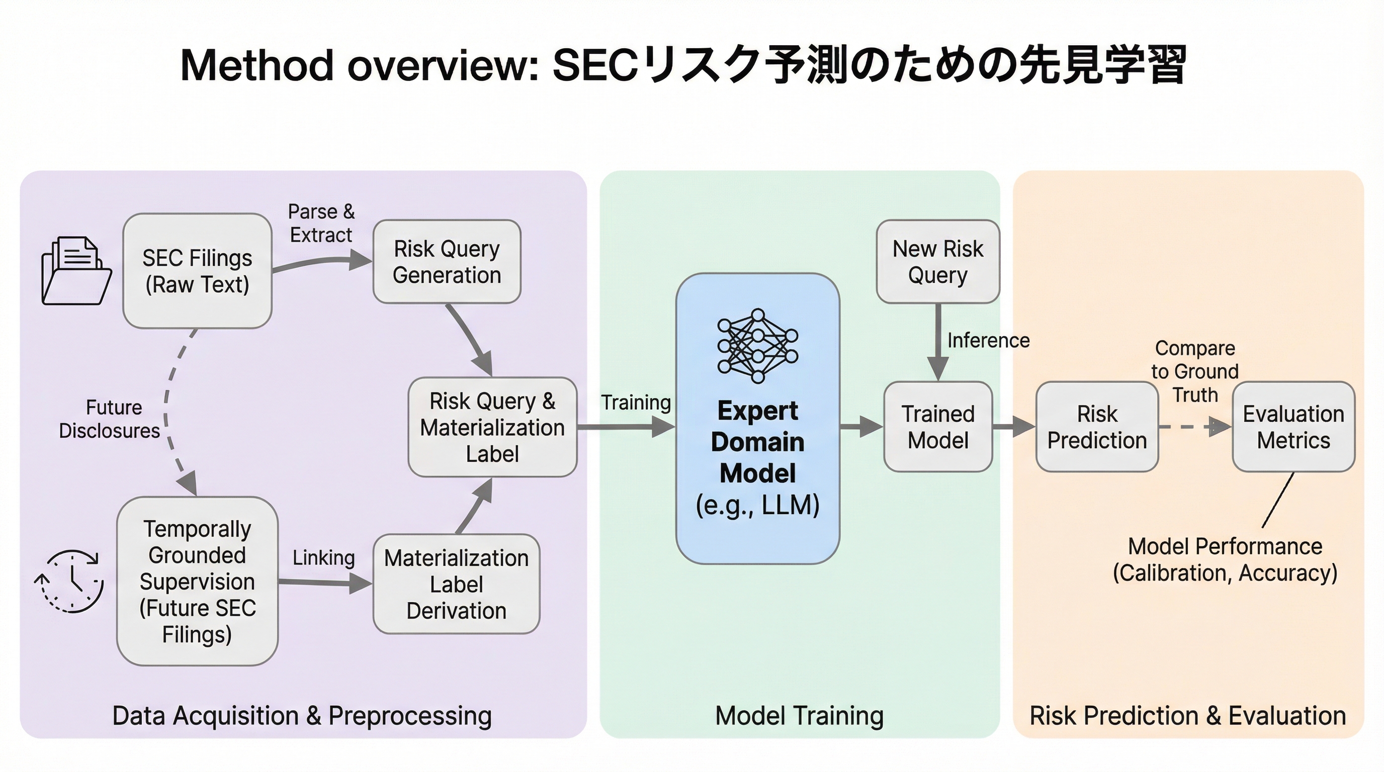 上場企業は、米国証券取引委員会(SEC)に対して定期的に提出する書類の中で、広範なリスクを開示することが義務付けられている。これらの開示情報は、潜在的な悪影響、業務上の課題、規制上の制約、戦略的な不確実性などを記述しているが、そのほとんどは定性的な表現に留まっている。企業は「何が起こり得るか」については説明するものの、それが「どの程度の確率で発生するか」を数値化して示すことは稀である。その結果、投資家やリスク管理の実務者は、体系的あるいは較正された指針がないまま、ナラティブなテキストからリスクの発生確率を推論しなければならないという課題を抱えている。 この問題の根本的な障害は、開示されたリスクと実際に発生した結果をリンクさせる、大規模かつリスクレベルでの教師データが存在しないことにある。リスクの結果が事前にアノテーションされることはほとんどなく、発生し得るリスクの空間は構造化されておらず、異種混合で、企業ごとに固有である。そのため、人間による大規模な手動のラベル付けは事実上不可能である。…