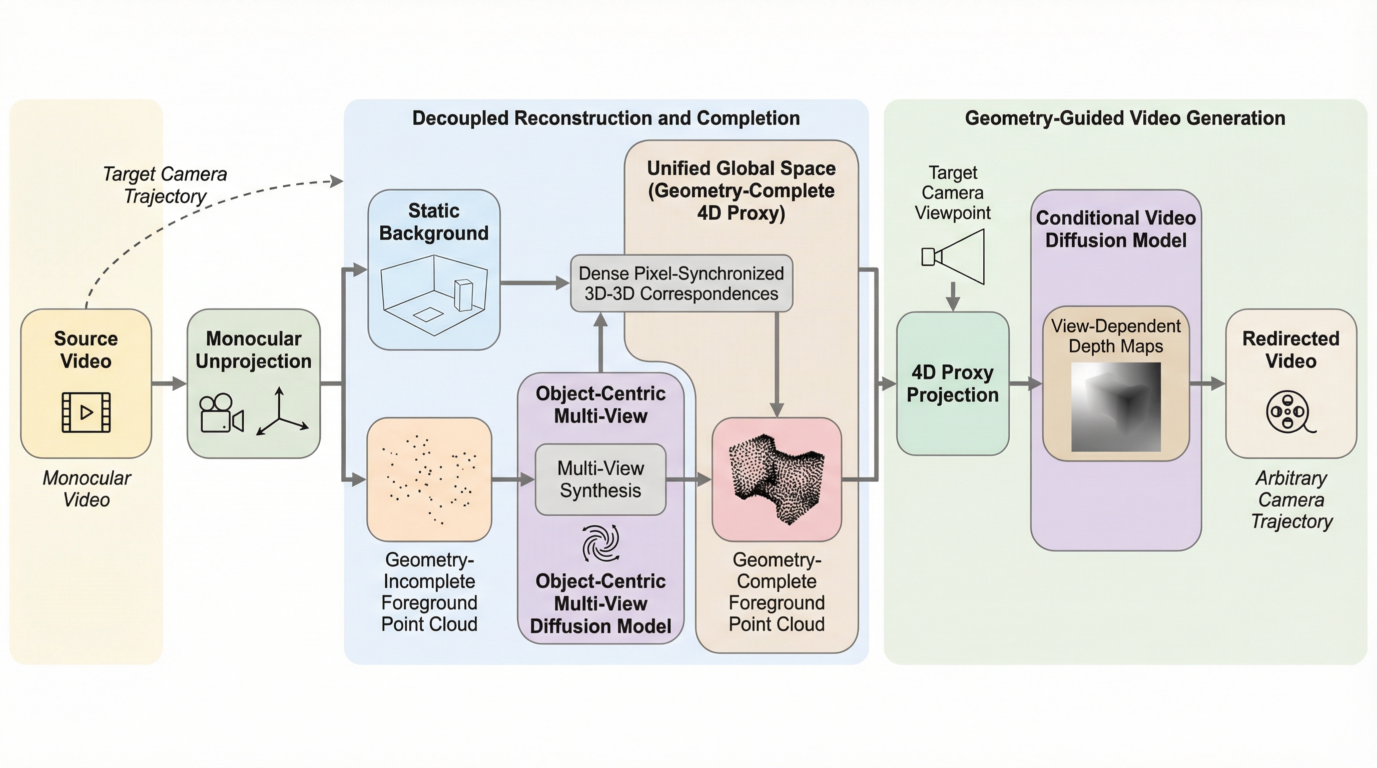 単眼動画から任意のカメラ軌道に沿った映像を生成するカメラリダイレクションにおいて、従来の「暗黙的制御」や「明示的ワーピング」では困難だった広角な視点変更と幾何学的な整合性の両立を、追加学習なしで実現する新フレームワーク「FreeOrbit4D」を提案しました。