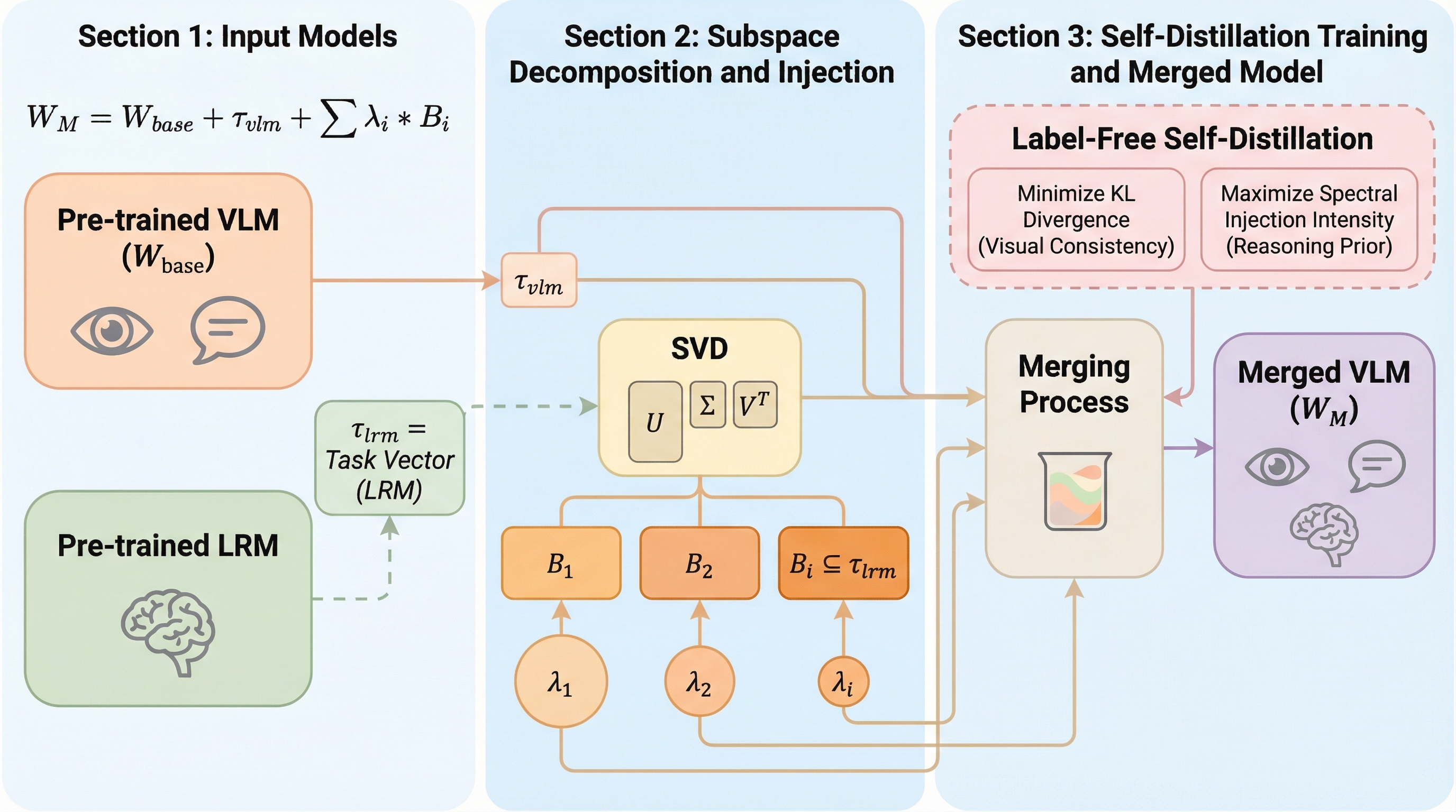 視覚言語モデル(VLM)に大規模推論モデル(LRM)の能力を統合する際、従来の層単位のマージ手法では視覚認識能力と推論能力の間に深刻なトレードオフが生じるという課題がありました。本研究で提案されたFRISMは、特異値分解(SVD)を用いて推論モデルのタスクベクトルをサブスペース単位に分解し、学習可能なゲートを通じて各成分の注入強度を適応的に調整することで、細粒度な推論能力の注入を実現します。ラベルなしの自己蒸留戦略と二重目的最適化を導入することで、元の視覚能力を損なうことなく、多様な視覚推論ベンチマークにおいて最先端の性能を達成することに成功しました。