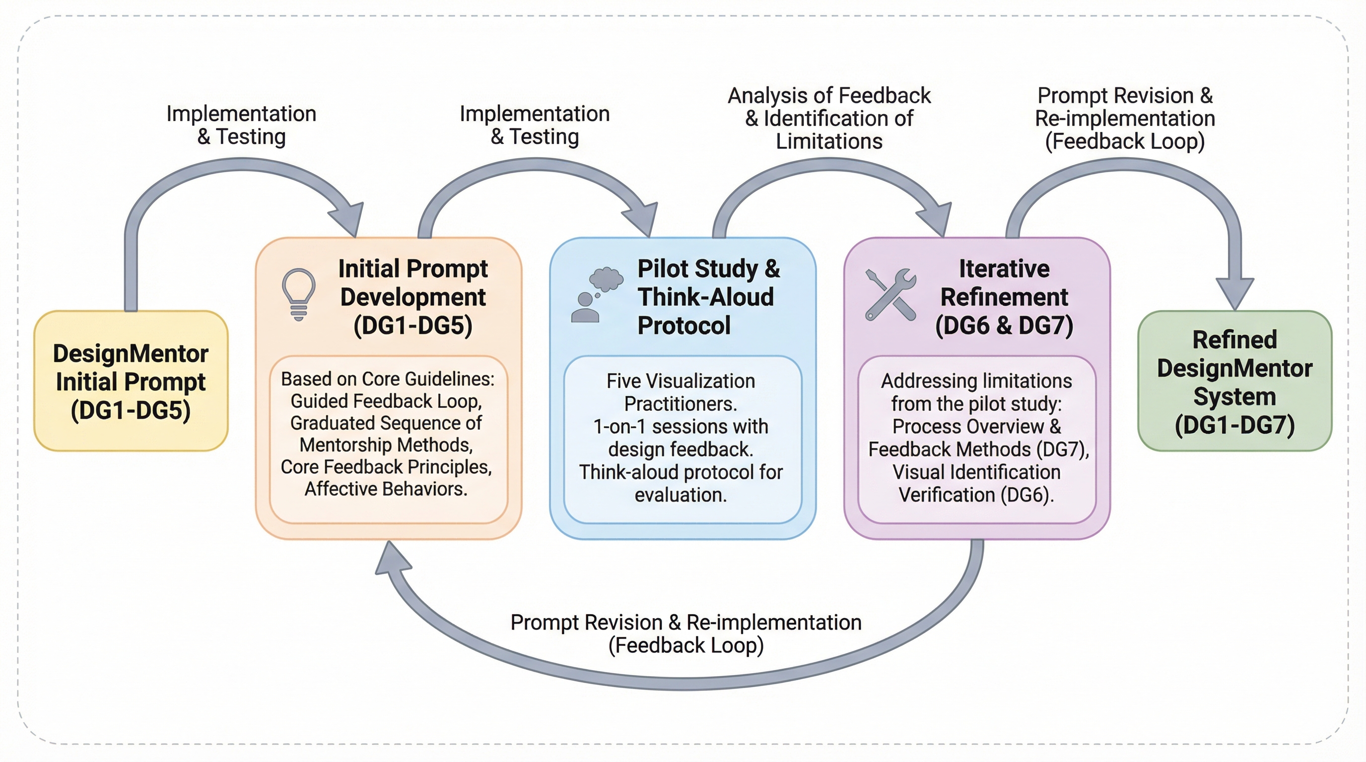 大規模言語モデル(LLM)を単なる回答提供者から、認知的徒弟制モデル(Cognitive Apprenticeship Model)に基づいた「デザインメンター」へと変革する手法を提案した。 6つの教育的手法(モデリング、コーチング、足場かけ、言語化、内省、探究)を構造化されたプロンプトとして実装し、ユーザーの思考を可視化させながら、内省的なデザイン推論を促す対話型の指導プロセスを構築した。 データ可視化の実務者を対象とした実験の結果、提案手法はベースラインのLLMと比較して、より深いデザイン推論とメタ認知的自覚を引き出すことに成功したが、タスクの性質やユーザーの経験レベルによっては、直接的な回答が好まれる場合もあることが明らかになった。