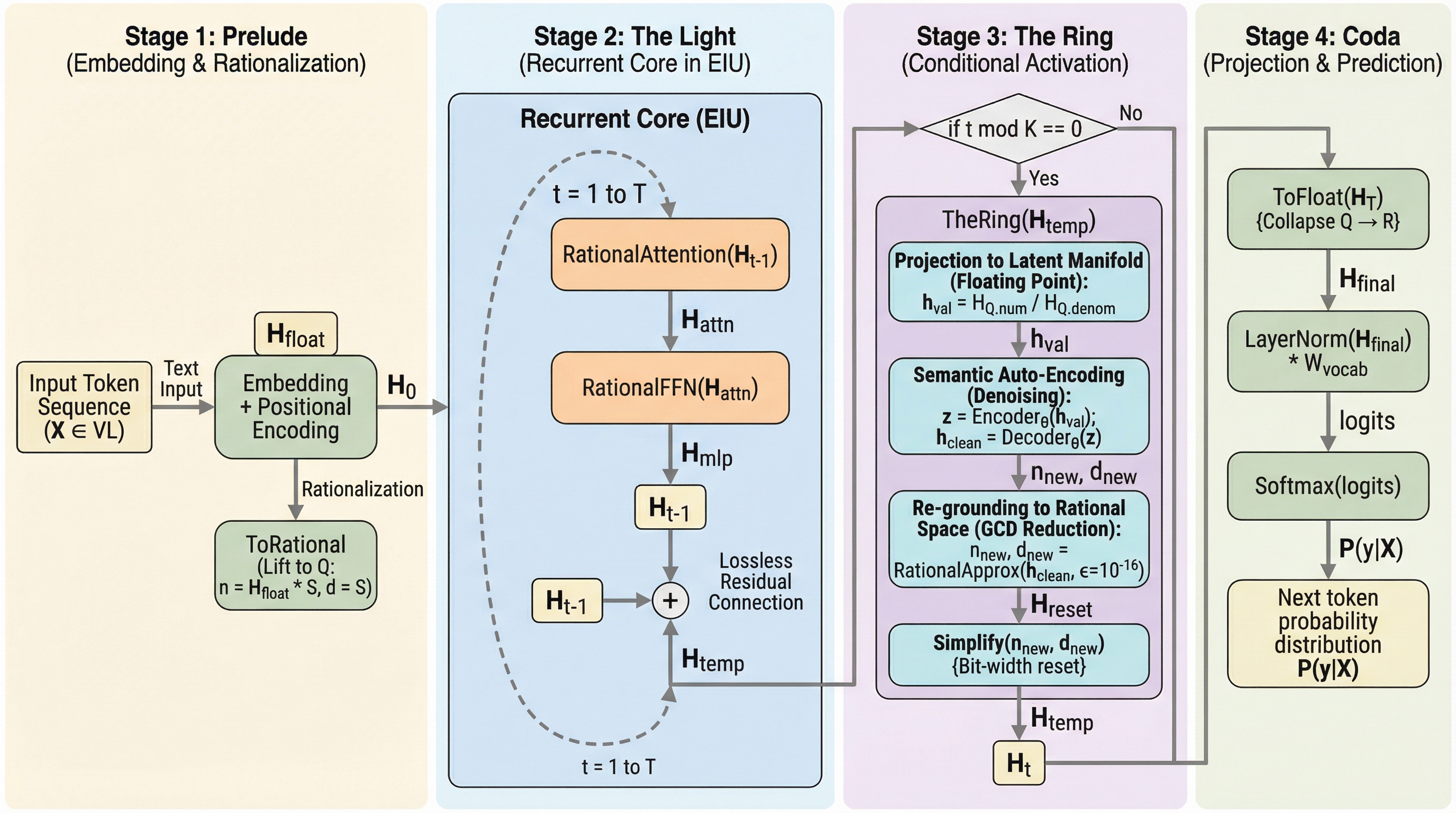 著者は、推論の深さは数値精度に比例するという「厳密性仮説(Exactness Hypothesis)」を提唱し、その実現のための「Haloアーキテクチャ」を提案した。このアーキテクチャの最大の特徴は、計算の基盤を実数(R)の近似フィールドから、有理数(Q)の厳密なフィールドへと移行させた点にある。これにより、例えば「1/3 + 1/3 + 1/3」という計算において、浮動小数点で見られる「0.9999999」のような近似値を排除し、厳密に「1」という結果を得ることが保証される。 Haloアーキテクチャは、無限精度の情報流である「The Light(光)」と、計算の複雑さを制御する「The Ring(環)」という2つのメカニズムで構成されている。「The Light」は、すべての演算を有理数(分子と分母のペア)として実行し、推論の深さが精度損失によって制限されないようにする。…