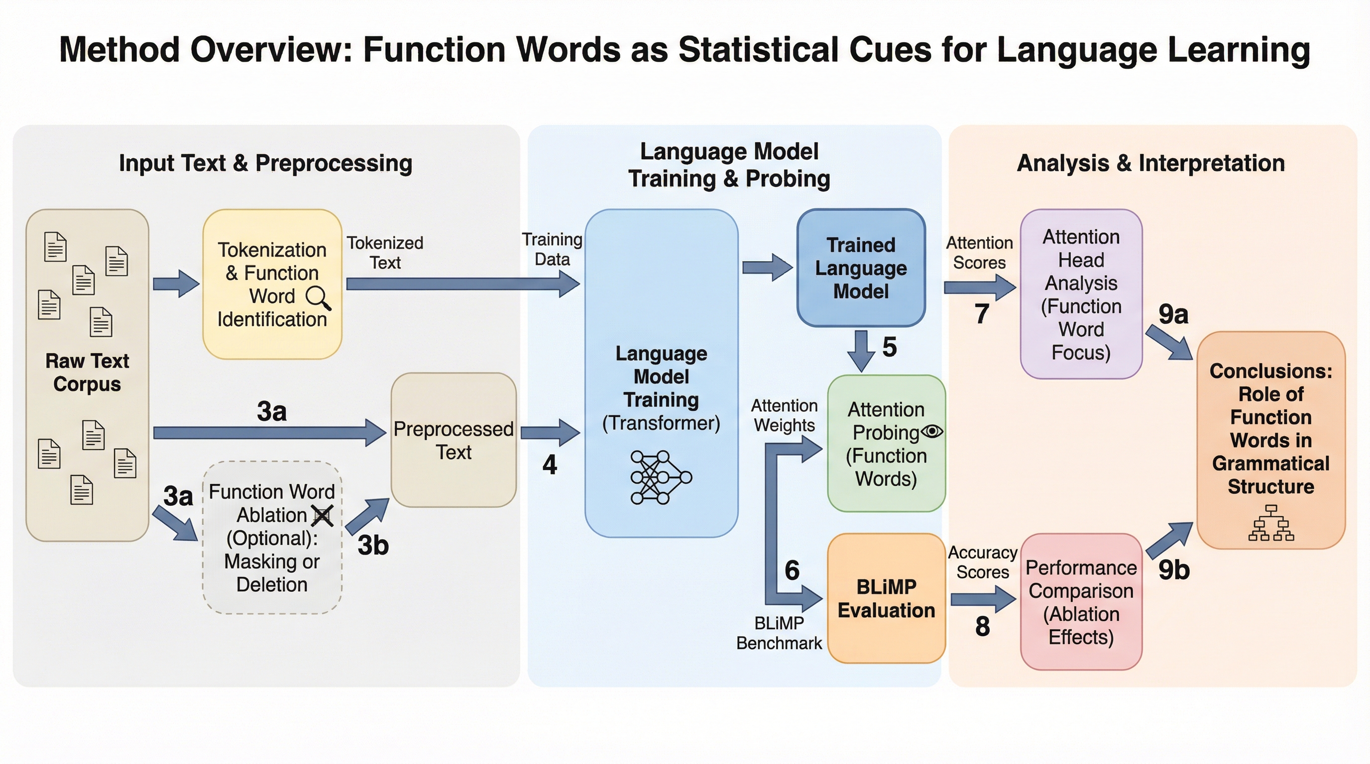 言語習得における中心的な謎の一つは、学習者が単語の並びという線形な入力から、いかにして抽象的な文法構造や階層構造を抽出しているのかという点にある。これまでの統計的学習の研究では、学習者が入力に含まれる遷移確率や韻律的なグループ化などの分布情報を利用していることが議論されてきた。その中でも、冠詞、助動詞、前置詞といった「機能語」は、言語習得において極めて重要な役割を果たすと考えられてきた。機能語には、習得を容易にする3つの主要な性質があると仮定されている。第一に、語彙的な出現頻度が非常に高いことである。第二に、特定の構文構造と信頼性の高い関連性を持っていることである。第三に、句の境界において一貫した位置に出現することである。 これらの性質により、機能語は学習における「アンカーポイント(固定点)」として機能し、解析すべき特定の単語列を強調したり、学習者が追跡すべき少数の高頻度アイテムを提供したりする可能性がある。しかし、これまでの研究には2つの大きな課題が残されていた。第一に、機能語の性質に関する結論の多くが、英語を中心とした少数の言語に基づいている点である。…
