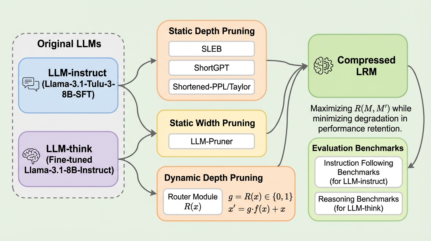 大規模言語モデル(LLM)の効率化に向けたプルーニング研究は、これまで指示追従型モデル(LLM-instruct)が中心であったが、本研究では長い思考プロセスを出力する推論中心型モデル(LLM-think/LRM)における有効性を初めて体系的に調査した。 実験の結果、プルーニング後の性能回復にはモデル本来の学習データ分布に合わせた調整が不可欠であり、一般的なコーパスを用いた場合、複雑な推論タスクでは性能がほぼ完全に崩壊する一方で、学習データを一致させることで高い性能を維持できることが判明した。 タスク特性による最適な戦略の違いも明らかになり、分類タスクでは層を削る静的深さプルーニングが有効な一方、生成や複雑な推論では次元を削る静的幅プルーニングが優れており、特に推論モデルにおいてはネットワークの深さが論理的整合性の維持に極めて重要である。