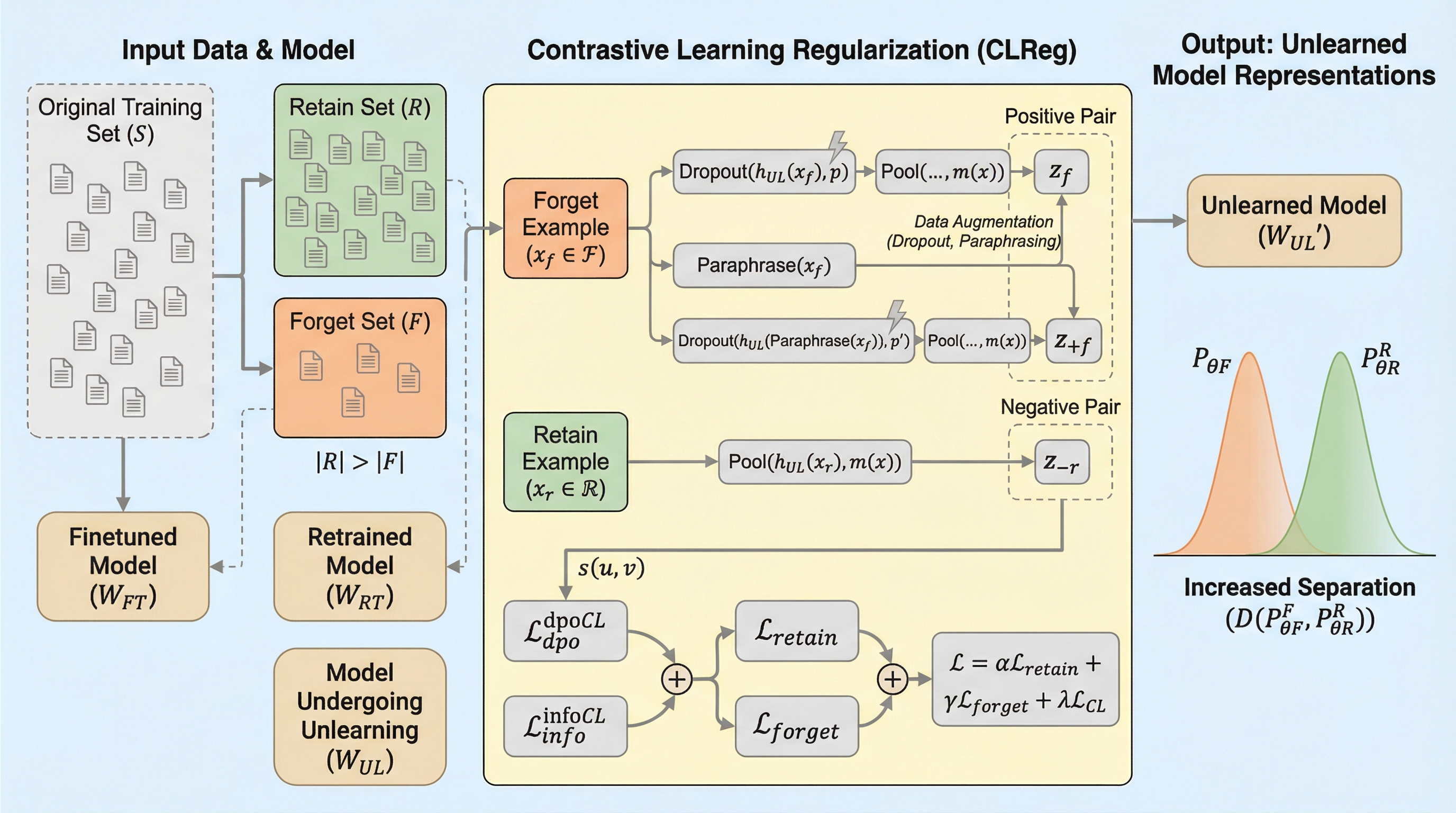 本論文では、LLMの潜在表現空間において忘却対象の概念を分離し、保持対象の表現から物理的に遠ざける「対照的表現正則化(CLReg: Contrastive Representation Regularizer)」を提案している。この手法の核心は、単に出力される単語の確率(Logits)を操作するのではなく、モデル内部の隠れ状態(Latents)そのものを整形(Shaping)することで、忘却と保持の間の干渉を根本から減少させる点にある。CLRegは、忘却対象の表現を特定のクラスターとしてまとめ上げつつ、それを保持対象の表現が位置する領域から反発させるように機能する。これにより、保持対象の表現に対する変化を最小限に抑えながら、忘却対象の概念だけを外科的に抽出して排除することが可能になる。 CLRegは、既存のあらゆるアンラーニングアルゴリズムに組み込んで使用できる汎用的な正則化項として設計されている。…