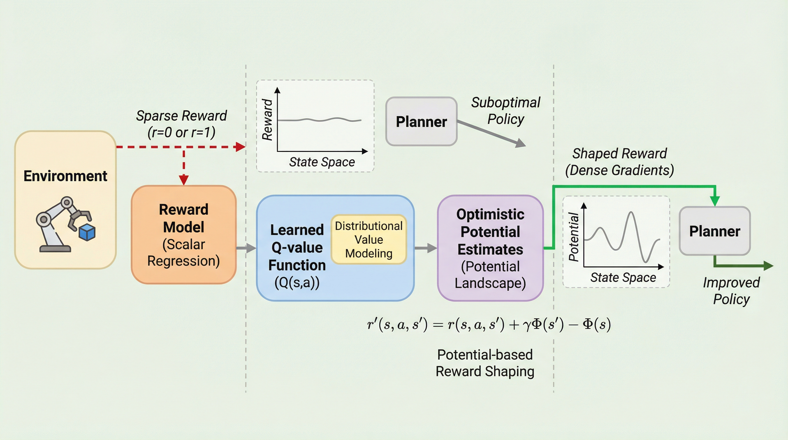本研究では、疎な報酬環境におけるMBRLを強化するために設計された、ポテンシャルに基づく報酬形成(PBRS)手法である「SLOPE(Shaping Landscapes with Optimistic Potential Estimates)」を提案している。SLOPEの核心的なアイデアは、報酬モデルの役割を「スカラ値の予測」から「内部的なポテンシャル景観の構築」へとシフトさせることにある。具体的には、エージェントが学習したQ値関数を状態空間上のポテンシャル曲面として扱う。このメカニズムにより、元々は勾配がなく平坦であった報酬構造が、密な情報を持つ景観へと変換される。これにより、エージェントは推定されたポテンシャルが高い状態を探索するように促され、ロールアウト中に方向性のある報酬信号を受け取ることが可能になる。…