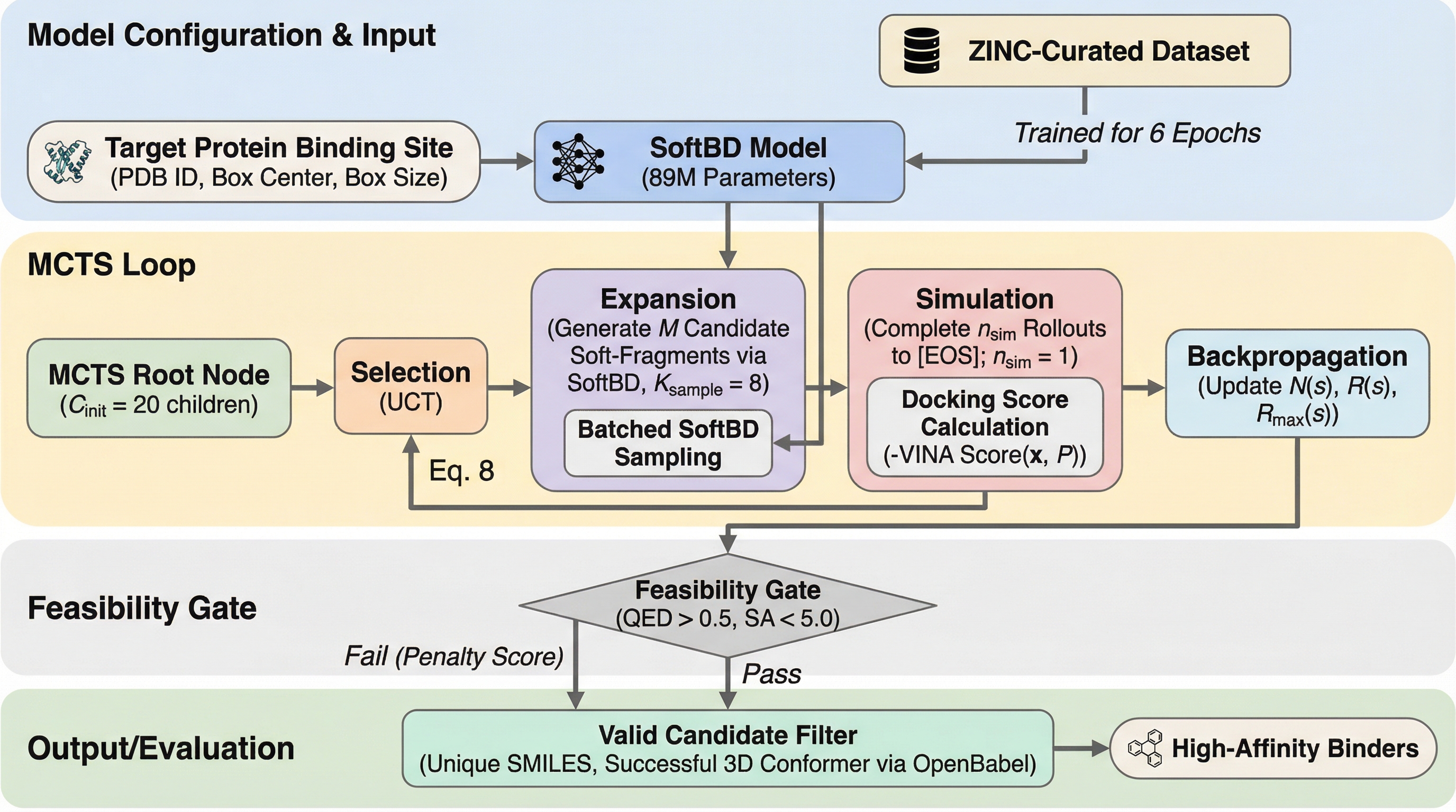 従来の分子言語モデルが直面していた「グラフ構造の把握不足」と「標的タンパク質への適応性欠如」を解決するため、SMILESを固定長のブロックに分割する「ソフトフラグメント」表現と、局所的な双方向拡散と自己回帰生成を融合させた世界初のブロック拡散モデル「SoftBD」を提案しました。 この手法は、化学的ルールに依存しない柔軟なブロック化によって複雑な構文を学習し、さらに薬理学的制約を判定するゲート付きモンテカルロ木探索(MCTS)を統合することで、特定の標的タンパク質に対して高い結合親和性を持つ分子を効率的に設計することを可能にしています。 大規模な実験の結果、SoftMolは化学的妥当性100%を達成しただけでなく、既存の最先端モデルと比較して結合親和性を9.7%向上させ、分子の多様性を2倍から3倍に高め、さらに推論速度を6.6倍に高速化するという、創薬プロセスを劇的に加速させる極めて優れた性能を実証しました。