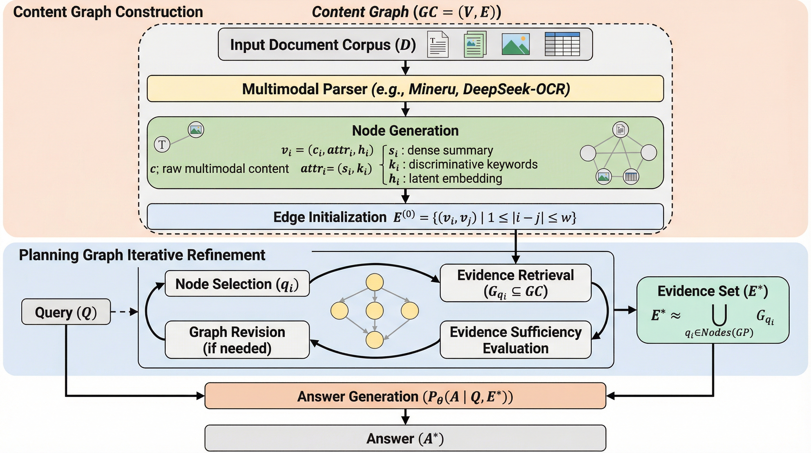 本論文では、これら二つの課題を解決するために、二重グラフシステムである「$G^2$-Reader」を提案している。このシステムの核心は、証拠の表現と検索・推論の両面をグラフ構造によって強化し、それらを動的に進化させるという点にある。具体的には、文書のネイティブな構造とモダリティを越えた意味論を保存するための「コンテンツグラフ($GC$)」と、推論プロセスを明示的に管理するための「プランニンググラフ($GP$)」の二つを維持する。コンテンツグラフは、文書内の段落や図表をノードとし、それらの間の参照関係や配置関係をエッジとして表現することで、情報の断片化を防ぐ構造化メモリとして機能する。一方、プランニンググラフは、複雑な質問を複数のサブ質問に分解し、それらの依存関係を管理する有向非巡回グラフ(DAG)として機能する。…