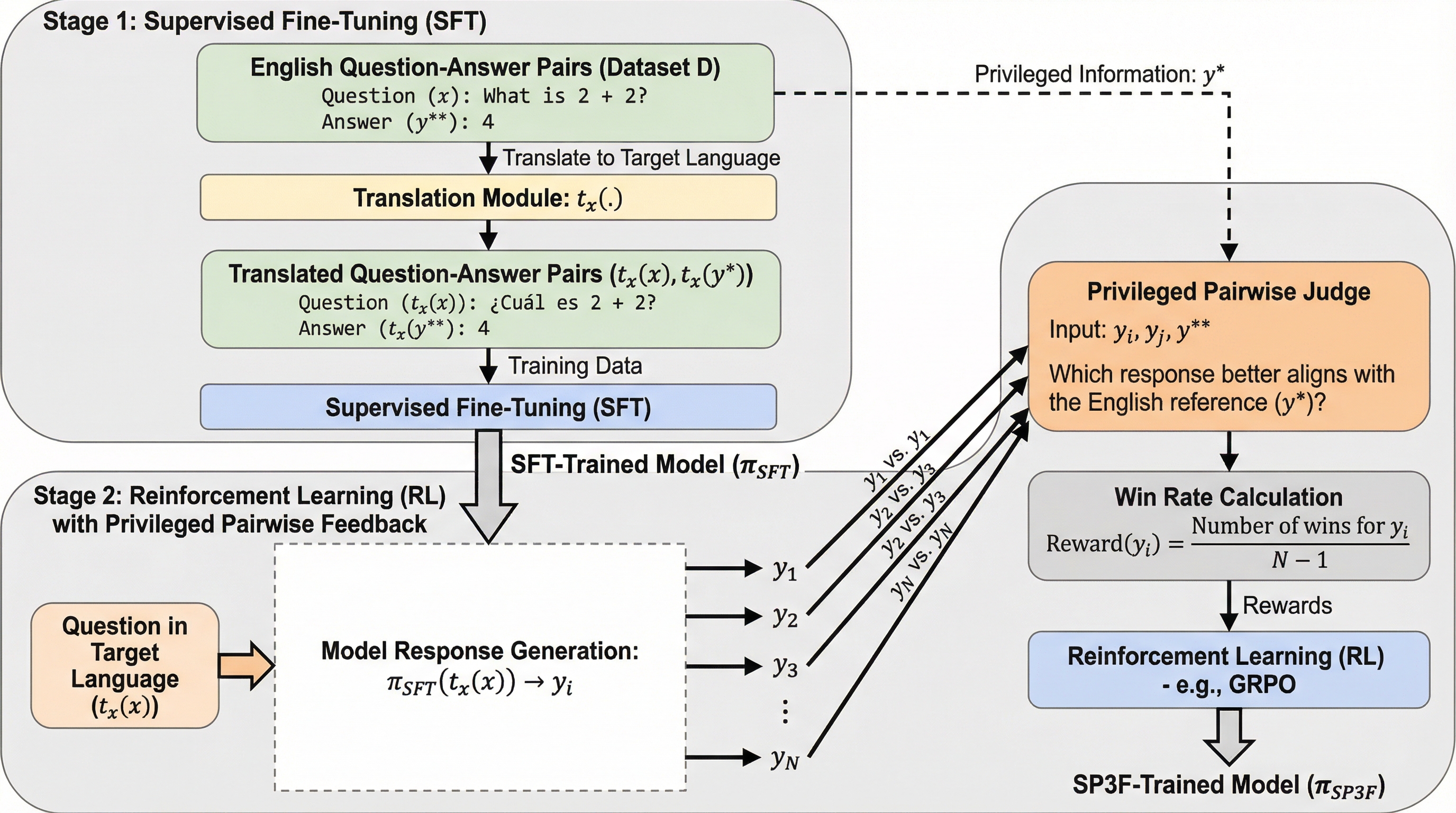 本研究では、学習データが少ない言語において推論性能が劇的に低下する課題に対し、対象言語のデータを一切追加で収集することなく、既存の英語資産を最大限に活用して多言語推論能力を向上させる二段階フレームワーク「SP3F(Self-Play with Privileged Pairwise Feedback:特権的ペア比較フィードバックを用いた自己対戦)」を提案しました。この手法の核心は、英語の正解情報を「特権(Privileged Information)」として活用し、モデルの自己対戦を通じて学習を加速させる点にあります。…