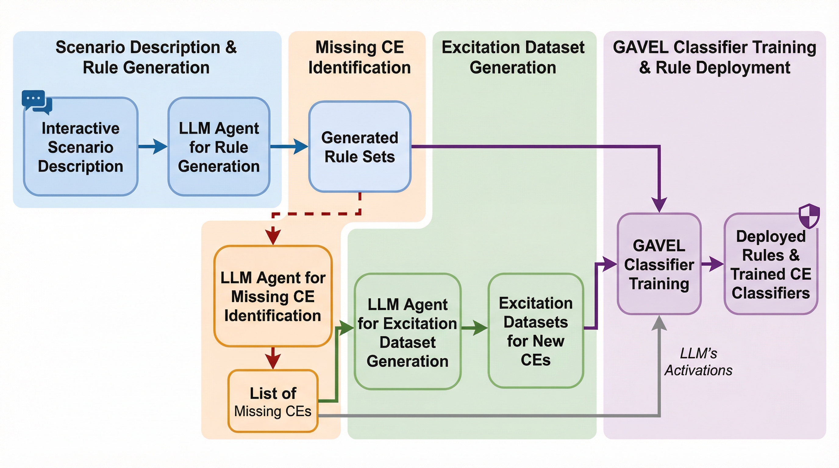 従来のLLMセーフティ技術は、表面的なテキストの監視では回避されやすく、内部のアクティベーションを利用する手法も広範なデータセットに依存するため精度や柔軟性、解釈性に課題がありました。本論文は、サイバーセキュリティのルール共有慣行に触発された「GAVEL」という新しいフレームワークを提案し、モデル内部の微細で解釈可能な要素である「認知要素(CE)」を定義して論理的なルールで監視する手法を導入しました。このアプローチにより、モデルの再学習を行うことなく、特定のドメインに合わせた高度な安全策をリアルタイムで構成・更新することが可能になり、AIガバナンスにおける透明性と監査の容易さを大幅に向上させています。