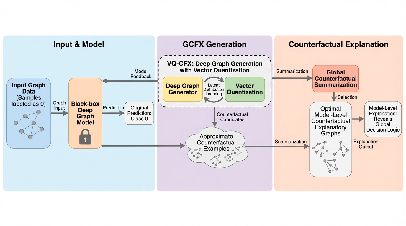 深層グラフ学習モデルの意思決定プロセスを全体的に把握するため、モデルレベルの反事実説明手法であるGCFXが提案されました。この手法は、ベクトル量子化を用いた生成モデルVQ-CFXによって高品質な反事実候補を生成し、要約アルゴリズムGCFSによって代表的かつ多様な説明セットを選択する二段構えの構成をとっています。