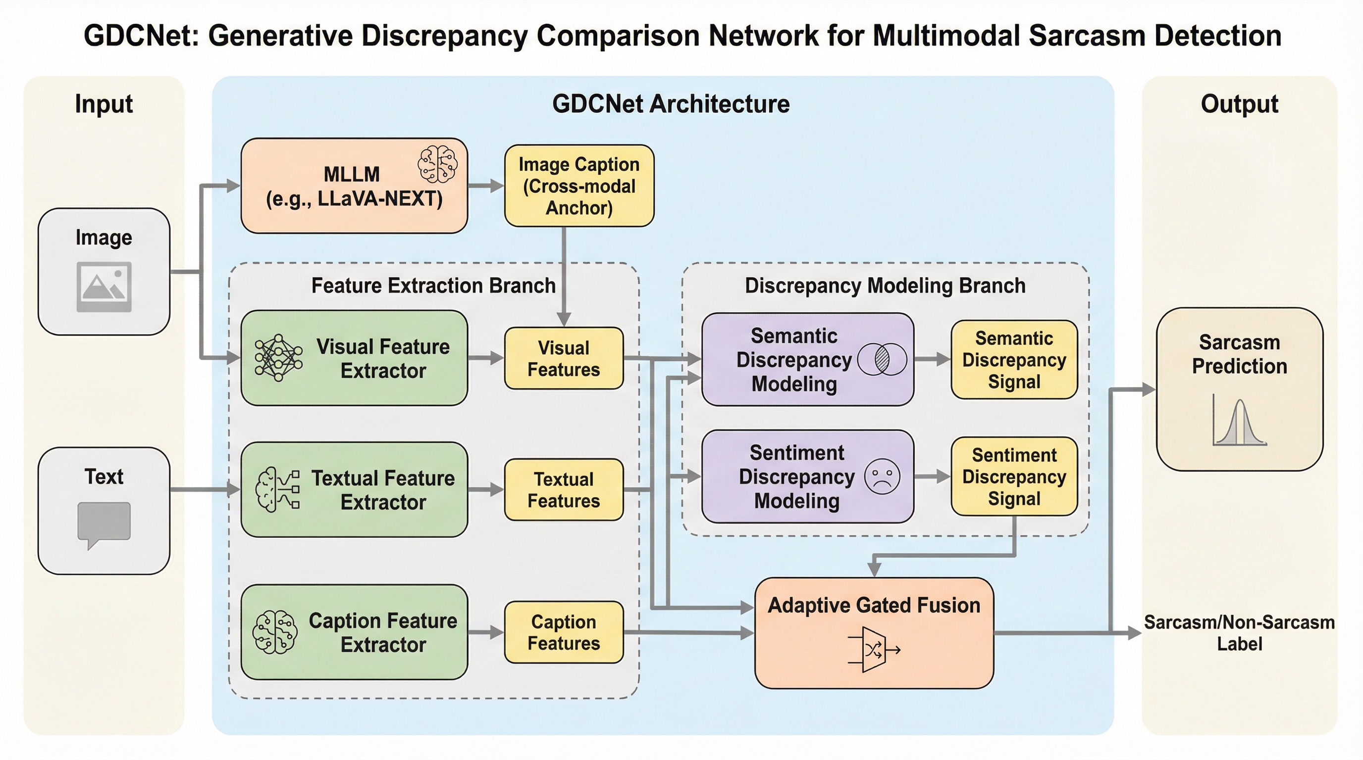 GDCNetは、画像とテキストのペアから皮肉を検出するために、マルチモーダル大規模言語モデル(MLLM)を「客観的な画像説明の生成器」として活用する新しいフレームワークである。従来のモデルがLLMに主観的な皮肉の理由を生成させていたのに対し、本手法は画像に基づいた事実的なキャプションを生成し、それを安定したセマンティック・アンカー(意味の指標)として活用することで、解釈の多様性によるノイズを抑制している。 このネットワークは、生成された客観的な画像説明と元のテキストとの間にある意味的な不一致、感情的な不一致、および画像とテキストの忠実度を測定する「生成的差異表現モジュール(GDRM)」を備えている。これにより、画像とテキストの間の微妙な矛盾や、文字通りの意味と意図された意味の乖離を、多角的な差異特徴として抽出することが可能になり、皮肉特有の複雑な不一致を捉えることができる。 大規模なベンチマークであるMMSD2.0を用いた実験において、GDCNetは既存のマルチモーダル手法や、GPT-4oなどの最新モデルを用いた直接的な推論手法を大幅に上回る最高精度を達成した。適応的なゲート付き融合メカニズムを導入することで、画像、テキスト、および差異情報の各モダリティの寄与を動的にバランスさせ、特定の情報の偏りを防ぎながら、頑健な皮肉検出を実現している。