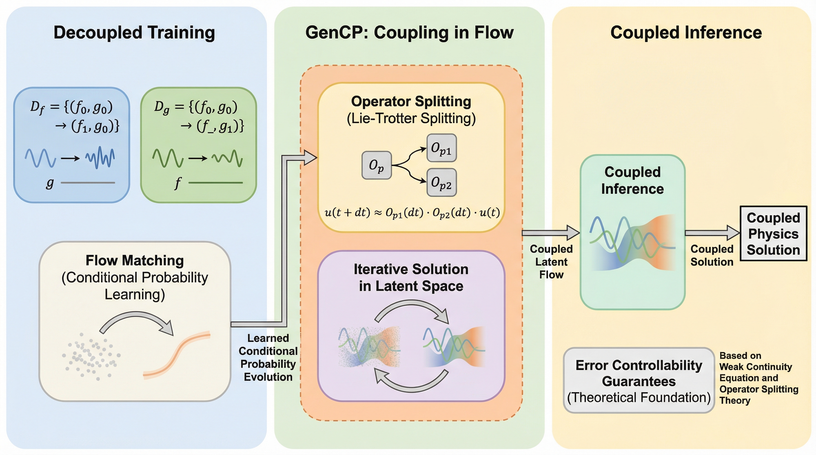 本研究は、複数の物理現象が相互に影響し合う複雑な連成物理システムのシミュレーションにおいて、個別に分離されたデータのみで学習を行い、推論時に結合状態を生成できる革新的な生成パラダイム「GenCP」を提案した。 この手法は、連成物理のモデリングを関数空間における確率密度の進化問題として再定義し、フローマッチングによる生成プロセスと数値計算の演算子分割理論を統合することで、高い再現性と計算効率、そして理論的な誤差制御の保証を同時に実現している。 流体構造連成や核熱結合などの複雑なシナリオを用いた検証の結果、既存の代理モデルや生成モデルと比較して誤差を最大で65%以上削減することに成功し、高価な連成データを必要としない堅牢かつ高効率なシミュレーションの枠組みを確立した。
