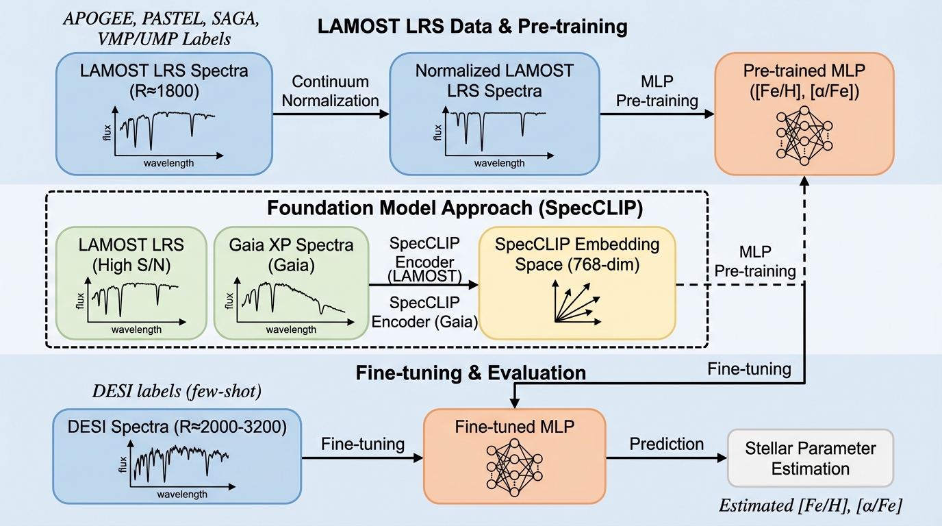 低分解能サーベイで学習した単純な多層パーセプトロン(MLP)でも、別サーベイの中分解能スペクトルへそのまま適用しても良好に推定でき、少量データでの追加学習でさらに整えられることを示しました。 / LAMOSTの低分解能スペクトルそのもの、またはトランスフォーマー系の自己教師ありモデルが作る埋め込みを入力としてMLPを事前学習し、DESIスペクトルに対してゼロショット適用と少数ショットの微調整を行い、残差ヘッド、LoRA、全層微調整を比較しました。 / 鉄の存在度では金属量が高い領域([Fe/H] > −1.0)で埋め込みが有利になり得る一方、金属量が低い領域ではスペクトル直接入力のMLPが相対的に優位になり、最適な微調整法は推定したい恒星パラメータによって変わることが分かりました。