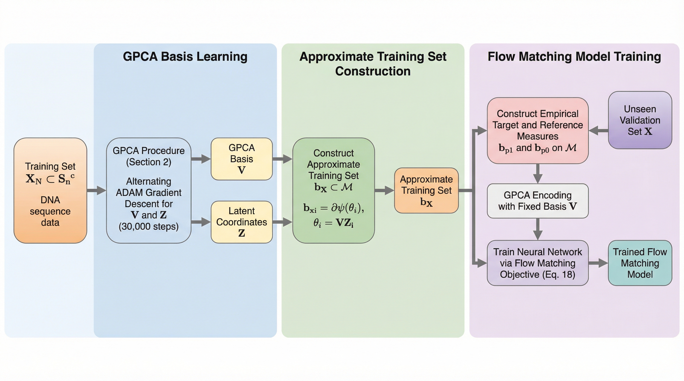 離散データの生成モデルを構築するため、カテゴリ分布の積多様体における指数パラメータ空間内に低次元の潜在部分空間を導入する「幾何学的主成分分析(GPCA)」を提案した。この手法は、離散変数間の統計的依存関係を符号化しつつ冗長な自由度を排除することで、高次元データの効率的な圧縮と正確な表現を可能にする。 パラメータ領域に独自のリーマン幾何学(e-metric)を導入することで、潜在空間とデータ多様体の間の距離を等長写像によって関連付け、測地線が直線となる効率的なフローマッチングを実現した。この幾何学的構成により、低次元の潜在空間上での学習が計算効率の高いものとなり、従来の計量を用いる手法よりも簡潔な目的関数で最適化が行える。 実験ではMNISTなどの高次元データセットにおいて、大幅な次元削減を行いながらデータを正確に再現できることが示された。教師なし学習による幾何学的な埋め込みによって、離散データの統計的性質を保持したまま、効率的な生成プロセスを実行できることが実証されている。