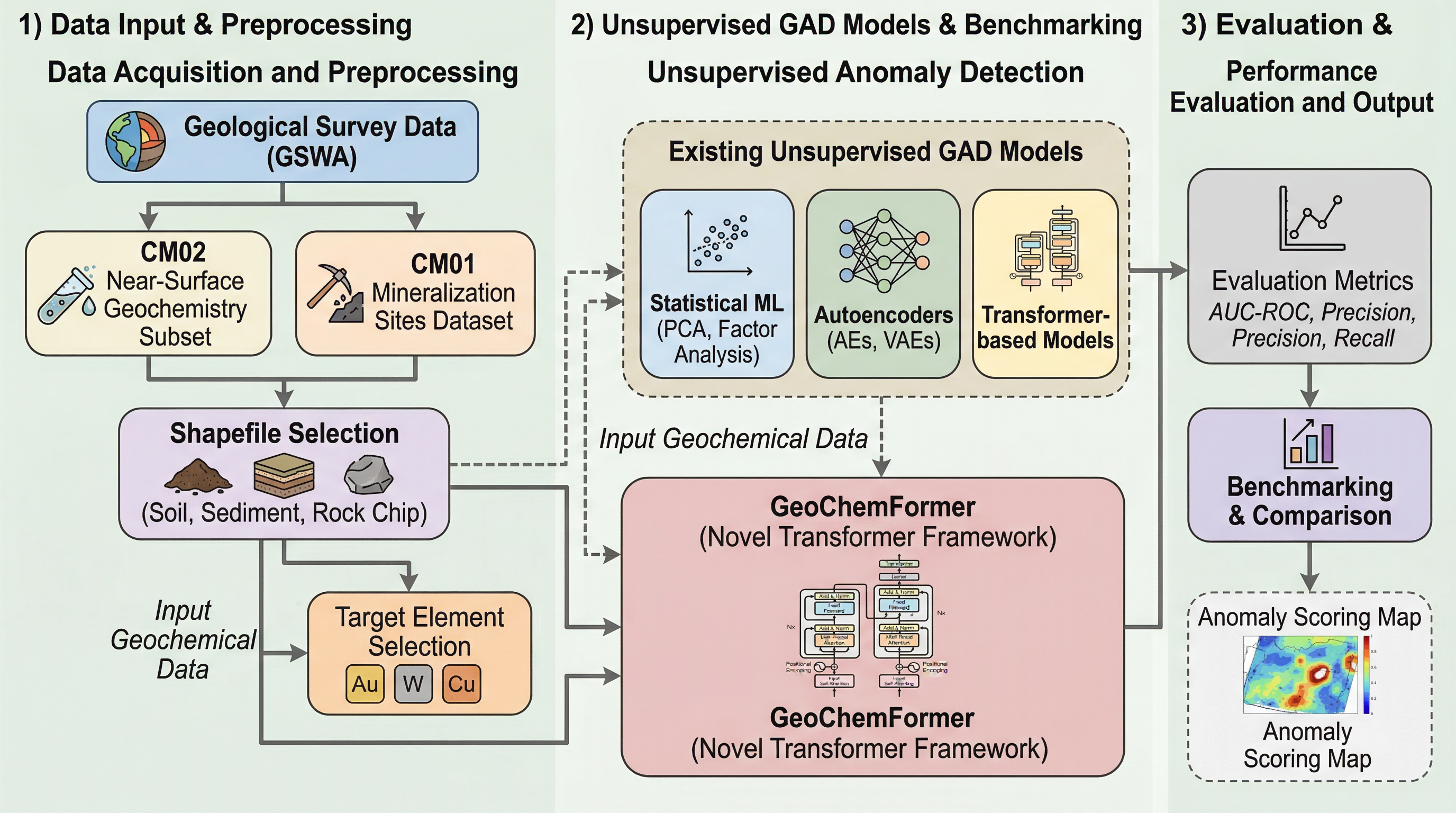 提案は二層あります。第一は GeoChemAD という公開ベンチマークの整備です。西オーストラリア州の政府地質調査データをもとに、複数地域、複数サンプリング媒体、複数ターゲット元素を含む8サブセットを作り、入力となる地球化学サンプルCSVと、既知鉱化サイトCSVを揃えています。これにより、教師なし異常検知法を同じ条件で比較できる基盤が初めて与えられます。