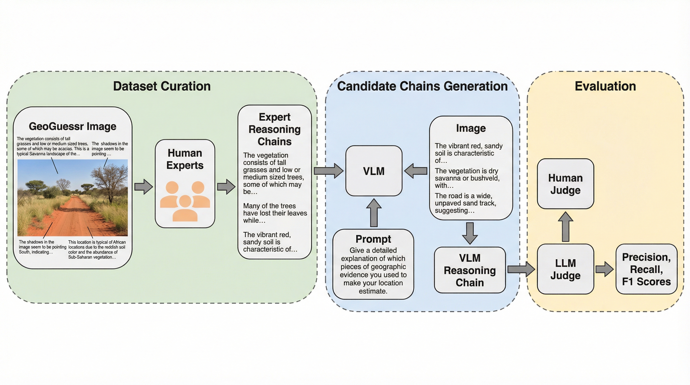 視覚言語モデル(VLM)は写真の撮影場所を特定する精度で人間に匹敵する能力を見せ始めていますが、その予測に至った根拠を説明する際に、画像内に存在しない情報を捏造するハルシネーションが頻発するという深刻な課題を抱えています。 本研究では、GeoGuessrの世界チャンピオンを含む専門家と協力し、500箇所のシーンに対して800件の高品質な推論過程を構築した世界初の地理的推論ベンチマーク「GeoRC」を提案し、モデルの根拠説明能力を厳密に評価する枠組みを確立しました。 評価の結果、GeminiやGPT 5などの最新モデルは予測精度では優秀なものの推論の質では人間に及ばず、LlamaやQwenなどのオープンウェイトモデルにいたっては画像を見ずに推測したのと大差ないレベルで推論に失敗していることが明らかになりました。