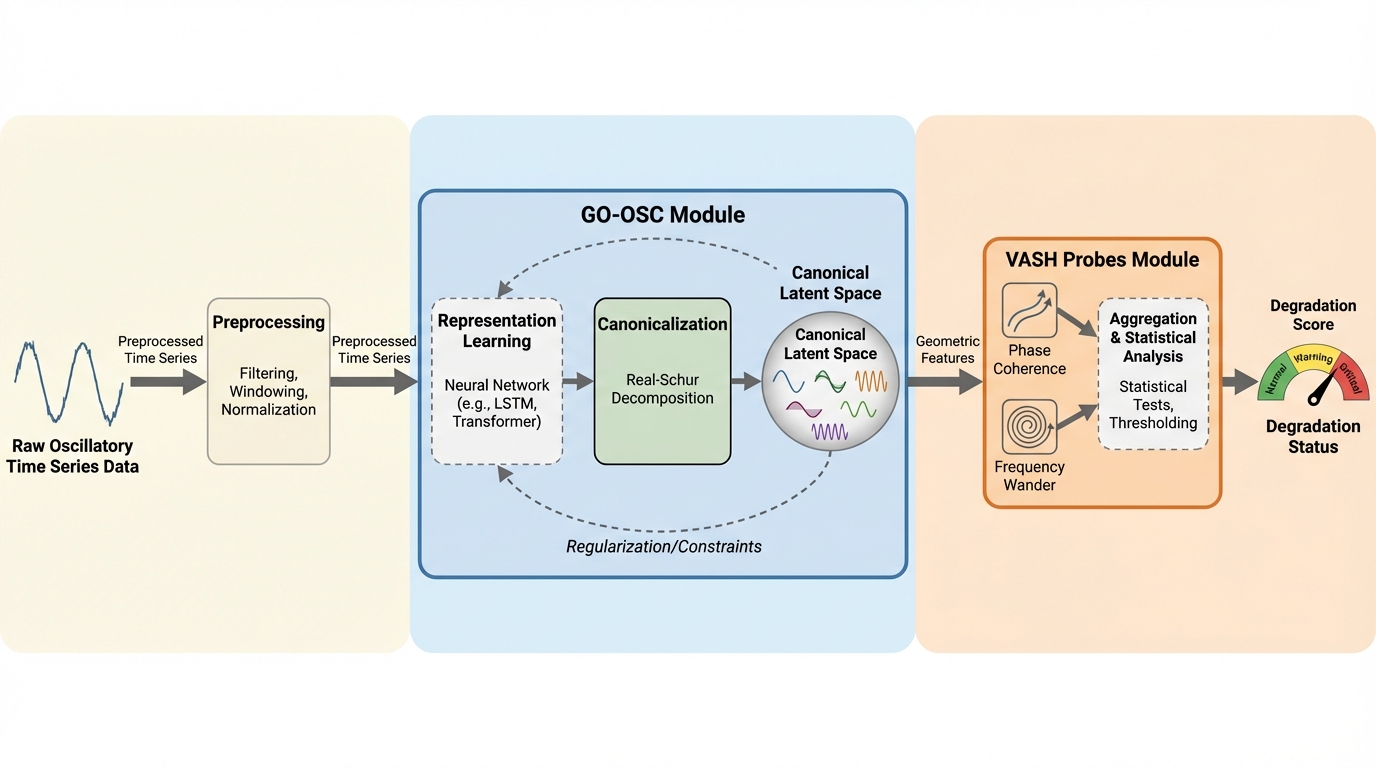 本研究の核心は、振動時系列データのために幾何学的な制約を明示的に組み込んだ表現学習フレームワーク「GO-OSC」と、それに基づく不変な線形幾何学的プローブの集合体「VASH」の提案です。GO-OSCは、潜在的なダイナミクスを「実シュア(real-Schur)振動ゲージ」という正準的な形式に制限することで、潜在状態空間モデルに固有の相似変換の曖昧さを完全に解消します。…