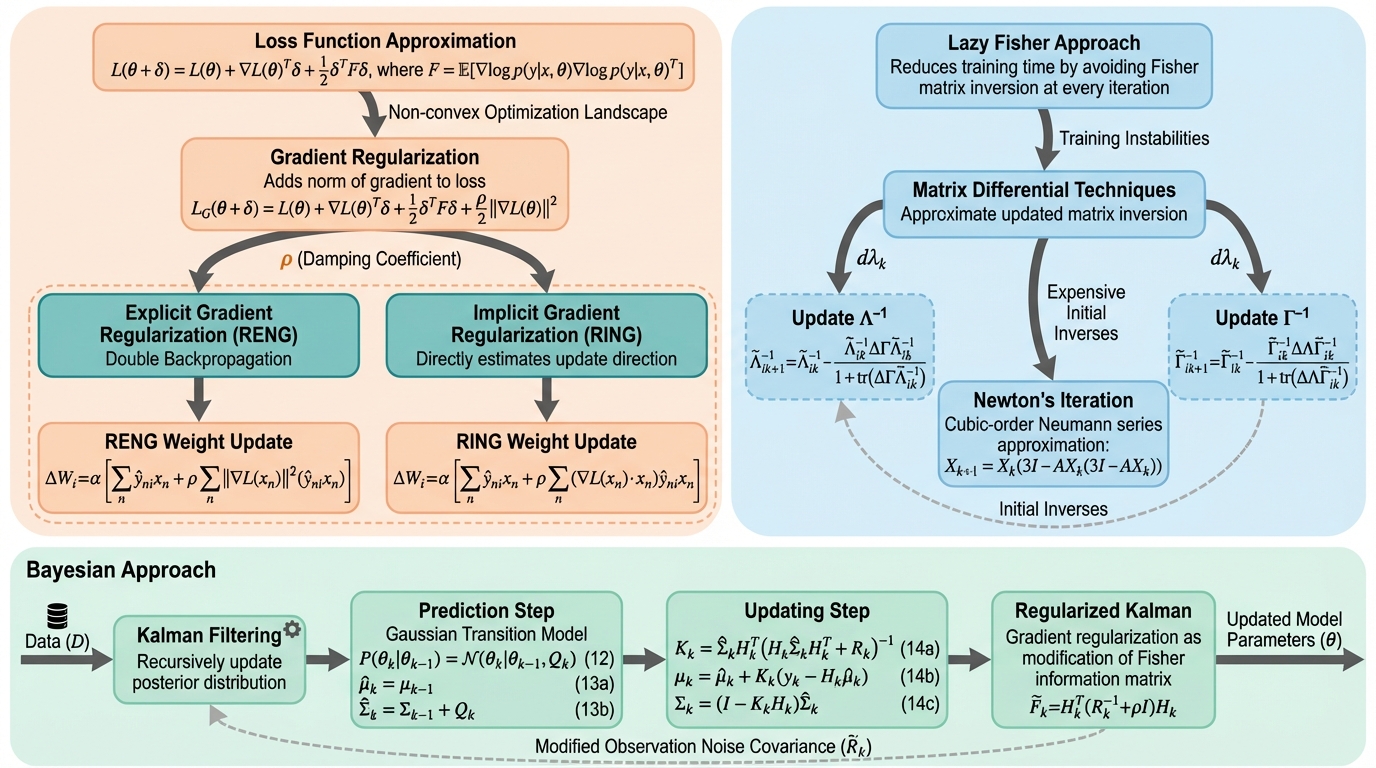 深層学習の訓練において、初期段階の収束を劇的に加速させる自然勾配法(NGD)と、損失景観の平坦な領域を探索して汎化性能を高める勾配正則化(GR)を統合した新しい最適化フレームワーク「GRNG」を提案した。 計算コストの課題を解決するため、フィッシャー情報行列を構造的に近似し再利用する頻度主義的な手法(RING/RENG)と、カルマンフィルタの原理を応用して行列の反転計算を完全に排除するベイズ主義的な手法(R-Kalman)の二つのスケーラブルなアルゴリズムを開発した。 画像分類や自然言語処理の広範なベンチマークにおいて、AdamWやSophiaといった既存の有力な手法を上回る収束速度と高い精度を実証し、さらに二層ニューラルネットワークにおける大域的最小解への収束を理論的に保証することに成功した。