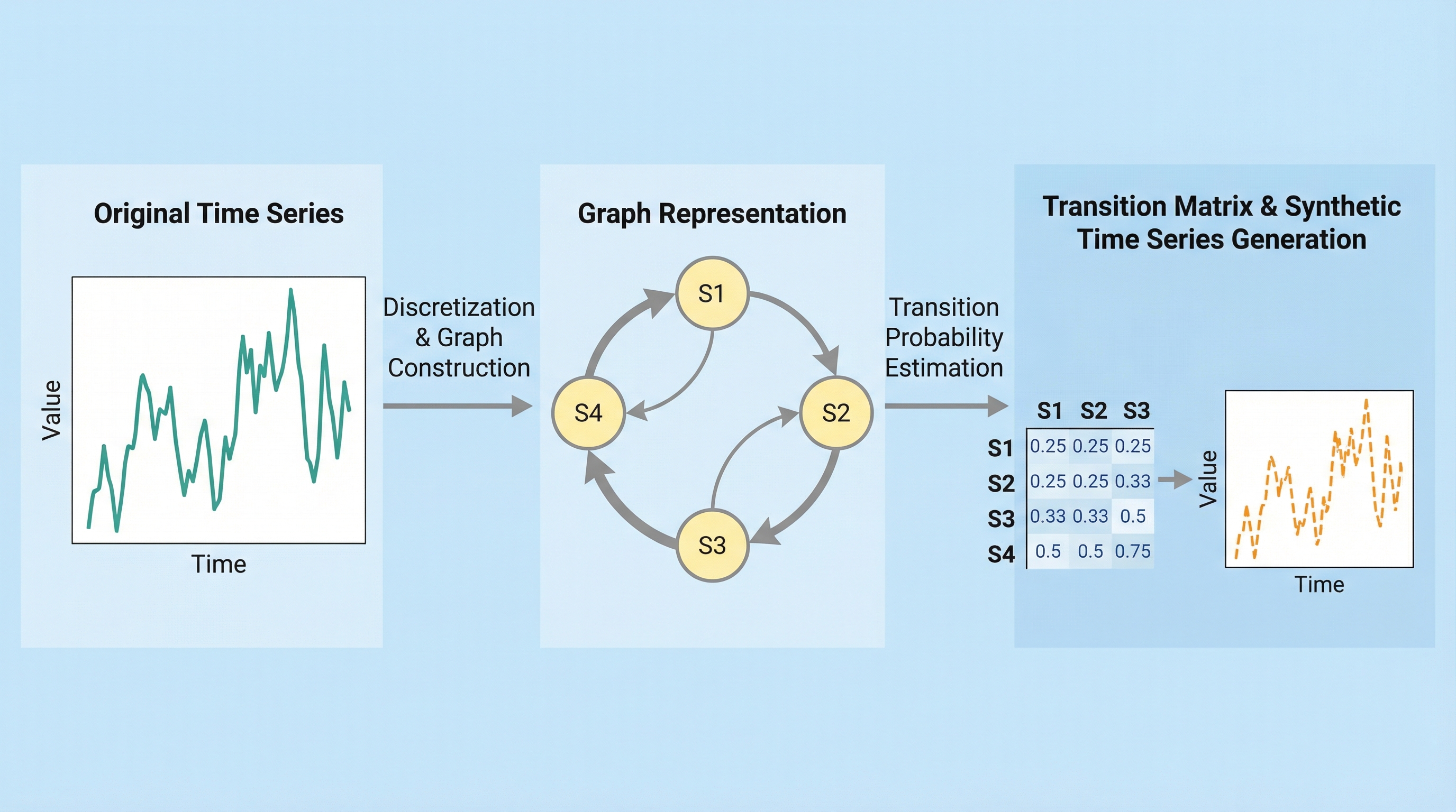 本論文が提案する「Grasynda(GRAph-based SYNthetictimeseriesDAtageneration)」は、時系列データをグラフ構造に変換し、その遷移確率行列を基に新しい時系列を合成する革新的なフレームワークである。この手法の核心は、時系列の各観測値を離散的な「状態」として定義し、連続する状態間の遷移をグラフのエッジとしてモデル化する点にある。これにより、時系列の背後にあるデータ生成プロセスを確率的な遷移モデルとして動的に捉えることが可能になる。具体的には、単変量の時系列をノード(状態)と有向エッジ(遷移)からなるネットワークへと変換し、そのエッジの重みとして遷移確率を算出する。…