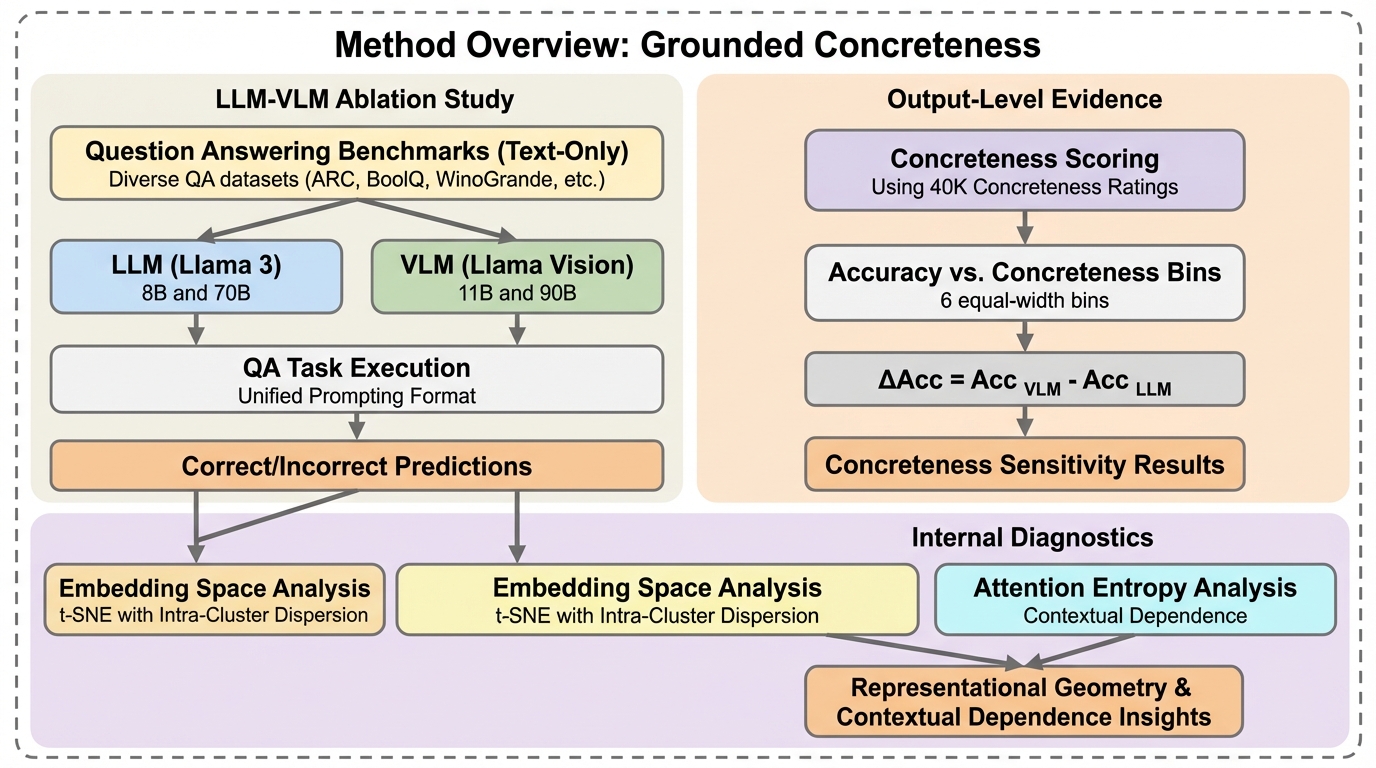本研究は、視覚と言語のマルチモーダルな事前学習が、推論時に画像を与えないテキストのみの条件下であっても、モデルの具体性に対する感受性を向上させるという仮説を提案し、それを実証した。具体的には、MetaのLlama 3.1(テキスト専用)とLlama 3.2(視覚対応)という、モデルスケールとバックボーンが一致したペアを用いて、視覚情報の有無が言語処理に与える影響を「アブレーション(切除)実験」として評価した。分析は、出力挙動、埋め込み表現の幾何学的構造、注意機構のダイナミクスの3つの相補的なレベルで行われた。第一に、質問応答(QA)の精度と質問文の具体性の相関を調べ、さらにモデル自身に単語の具体性を評価させて人間の基準値との一致度を測定した。…