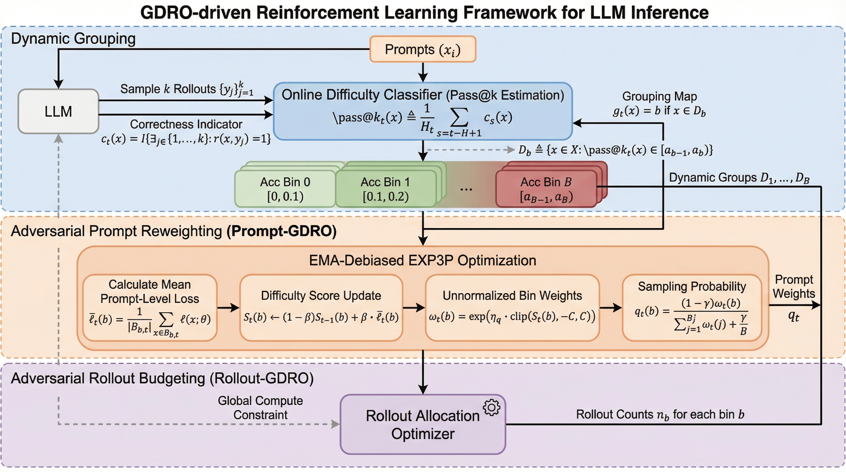 本研究では、上述の静的な一様性を打破するために、グループ分布ロバスト最適化(GDRO)の理論を応用した「マルチ敵対的GDROフレームワーク」を提案しています。このフレームワークの最大の特徴は、学習プロセスを「学習者(LLM)」と、その弱点を突こうとする「複数の敵対者(アドバーサリ)」との間のゼロサムゲームとして定式化している点にあります。具体的には、モデルの現在の習熟度に基づいてプロンプトを動的にグループ化し、それらのグループ間で学習の重みと計算資源を最適に配分する2つの独立した敵対的メカニズムを導入しました。 第一の柱は、データの配分を司る「Prompt-GDRO」です。…