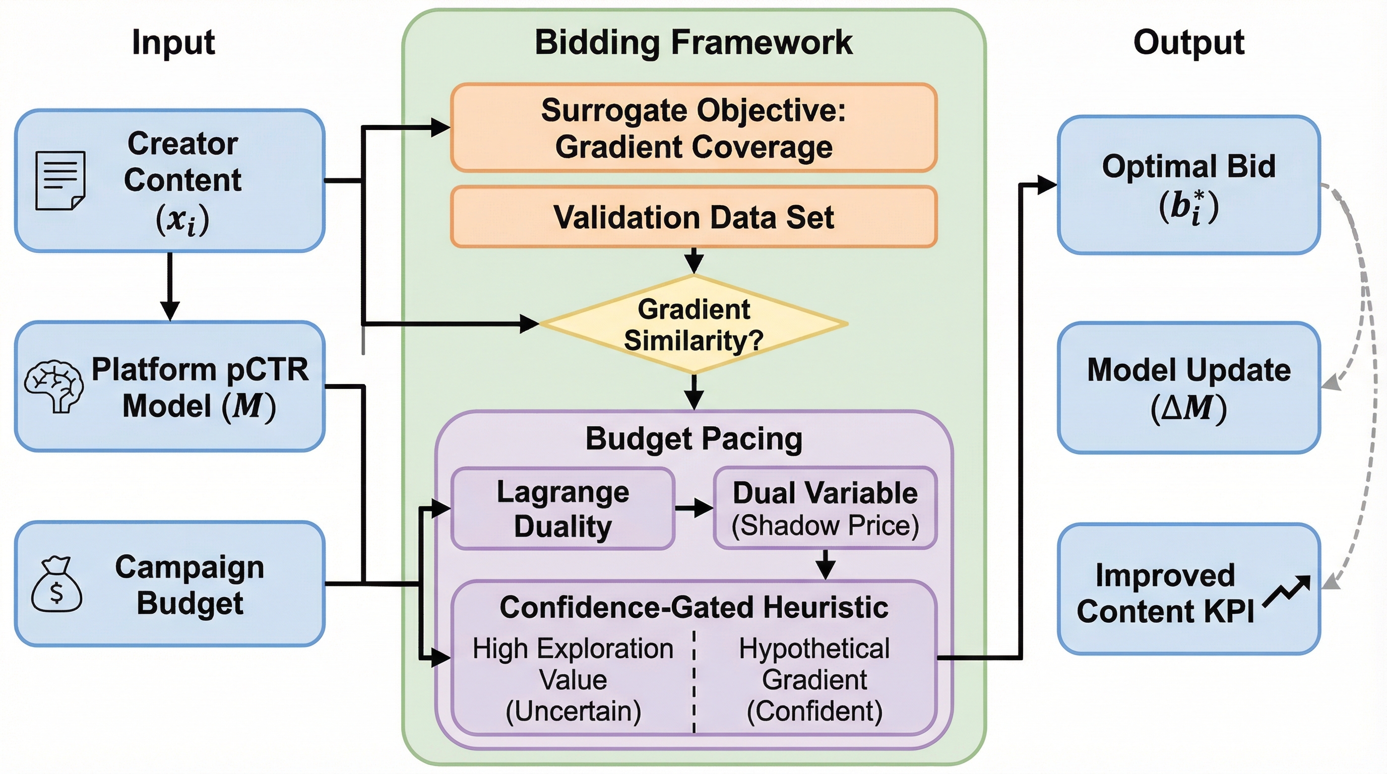現代のコンテンツプラットフォームでは、新規投稿の露出を確保するために有料プロモーションが活用されていますが、実証分析の結果、この仕組みには直感に反する欠陥があることが判明しました。質の高いコンテンツに対して不適切なオーディエンスへの露出を強制すると、エンゲージメント信号が汚染され、将来的な推薦アルゴリズムによる評価が低下してしまいます。 本研究では、コンテンツプロモーションを「短期的な価値獲得」と「長期的なモデル改善」の二重目的最適化問題として再定義し、モデルの不確実性を低減するための計算可能な指標として「勾配カバレッジ」を導入しました。これは統計学におけるフィッシャー情報量や最適計画法との理論的な関連性を持ち、リアルタイムの入札環境でも実行可能な設計となっています。 ラグランジュ双対性に基づく二段階の自動入札アルゴリズムを開発し、ラベルが不明な入札時点でも学習信号を推定できる信頼性ゲート付きのヒューリスティックを提案し、実際のデータセットを用いた検証で、従来の戦略を上回るモデル精度とオーガニックな成果の向上を確認しました。