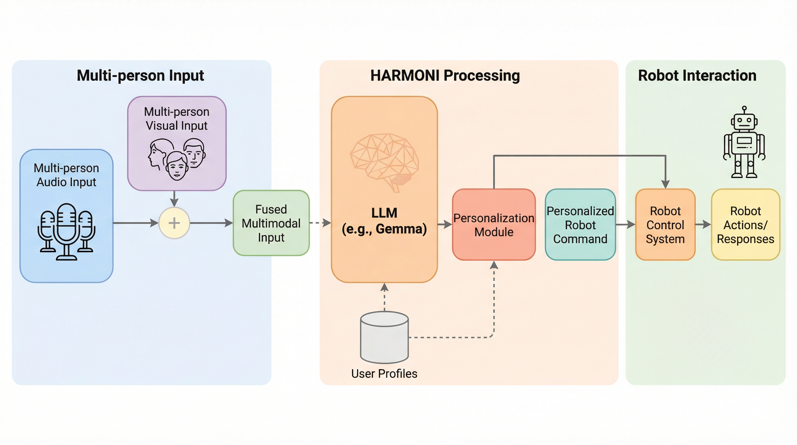HARMONIは、介護施設のような多人数が同時に存在する複雑な環境において、大規模言語モデル(LLM)の能力を最大限に引き出し、個々のユーザーに対する長期的なパーソナライズを実現するための革新的なマルチモーダル・フレームワークである。 このシステムは、知覚、世界モデリング、ユーザーモデリング、生成という4つの独立したモジュールを統合することで、動的な話者交代や予期せぬ割り込みに対してもリアルタイムで文脈を維持し、短期および長期のメモリを効果的に管理しながら、プライバシーと倫理に配慮した応答を生成する。 実際の介護施設での実証実験や複数の標準データセットを用いた厳密な検証を通じて、従来の手法よりもユーザー識別の正確性や対話の質、そして利用者の満足度が大幅に向上することが確認されており、社会支援ロボットの実社会展開における重要な技術的基盤を提供している。