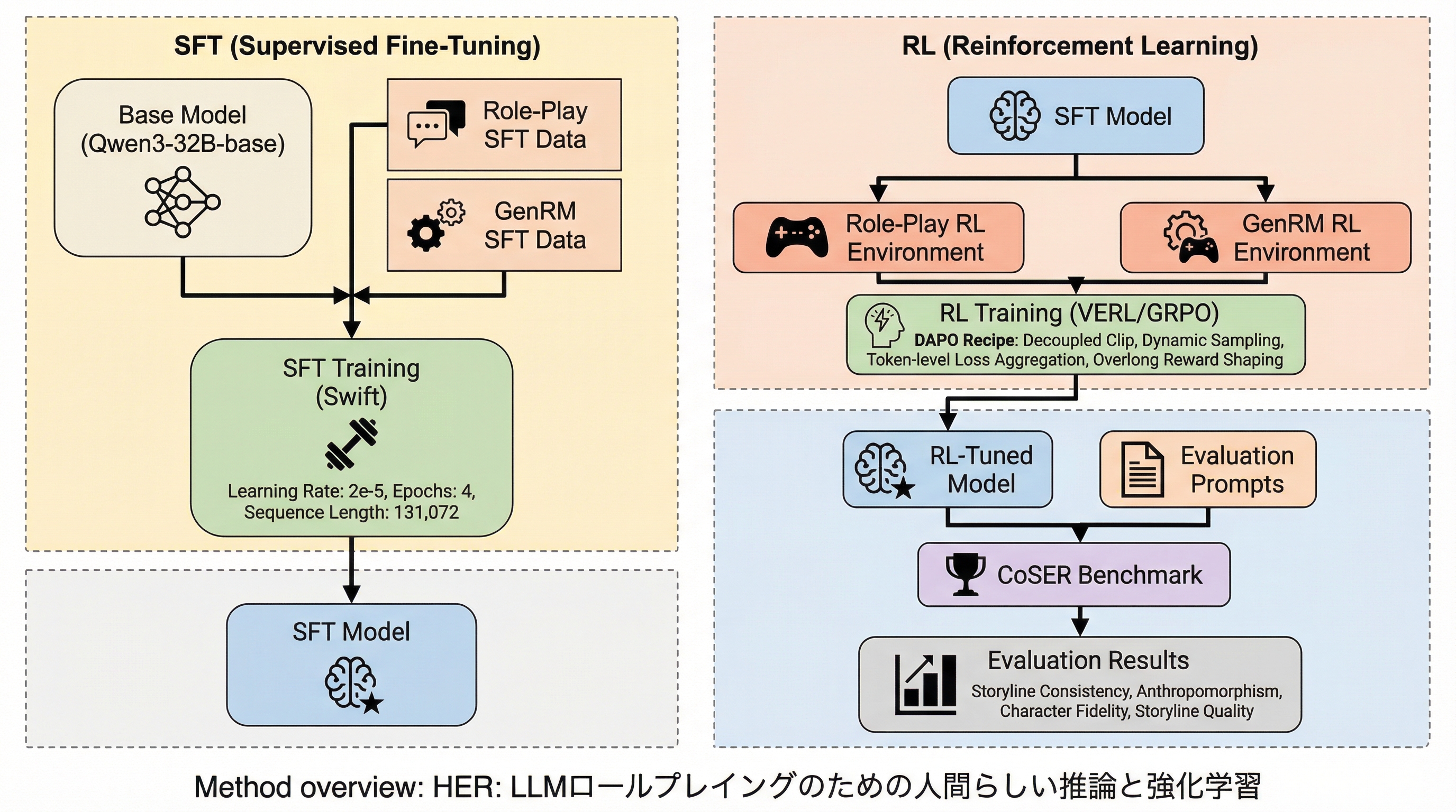HER(Human Emulation Reasoning)は、LLMのロールプレイングにおいてキャラクターの内面的な思考を高度にシミュレートするための統合フレームワークであり、隠された三人称視点の「システム思考」と、公開される一人称視点の「ロール思考」を分離した二層構造の思考プロセスを導入しています。 高品質な推論データの不足と人間との好みの不一致を解消するため、既存の対話データから推論プロセスを逆生成するパイプラインを構築し、専門家が抽出した51の原則に基づく生成報酬モデル(GenRM)を用いた強化学習によってモデルを最適化しています。 Qwen3-32Bをベースとした実験では、CoSERベンチマークで30.26%、Minimax Role-Play Benchで14.97%の性能向上を達成し、キャラクターの性格維持や物語の一貫性、長期的な対話の質において従来のモデルを大きく上回る成果を示しています。