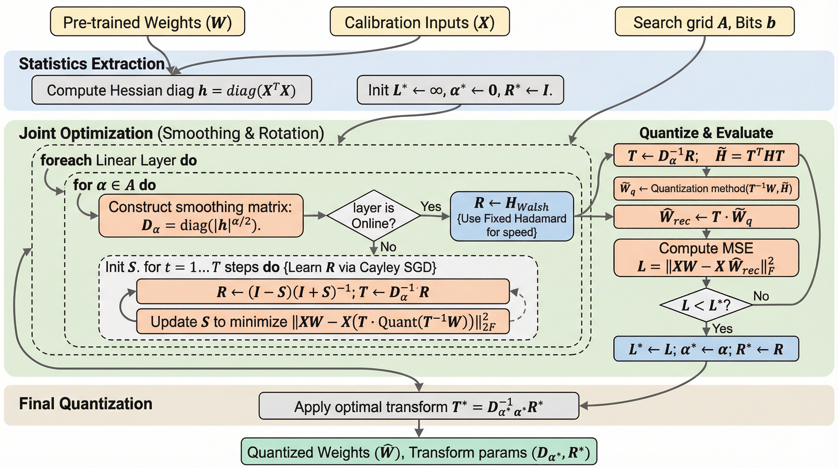 本論文では、量子化の前に損失曲面の幾何学的構造を能動的に再構成する「Hessian Robust Quantization(HeRo-Q)」アルゴリズムが提案されました。 HeRo-Qの核心的なアイデアは、重み空間に対して最適な線形変換を適用することで、ヘッセ行列のスペクトル半径(最大固有値の大きさ)を抑制し、量子化に対するモデルの感度を事前に低減させることにあります。 このフレームワークは、特定のモデルアーキテクチャや活性化関数に依存しない汎用的な設計となっており、既存のPTQパイプラインにシームレスに統合できる点が大きな特徴です。 具体的には、重み行列に対して「対角平滑化(Diagonal Smoothing)」と「学習可能な直交回転(Learnable Orthogonal Rotation)」という2つの相乗的な操作を組み合わせた変換行列を導入しています。…