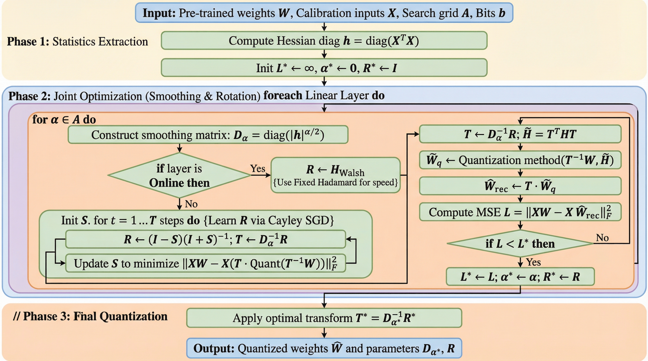 本論文では、量子化の前に損失曲面を能動的に再構成する「Hessian Robust Quantization(HeRo-Q)」アルゴリズムが提案されました。このフレームワークの核心は、量子化誤差そのものを直接最小化しようとする従来のアプローチから脱却し、重み空間に対して相乗的な結合変換を適用することで、ヘッセ行列の条件付けを根本から改善する点にあります。具体的には、スペクトル半径を圧縮して外れ値の曲率を抑える「対角平滑化」と、量子化ノイズを各次元に再分配して敏感な方向との整合を最小限にする「学習可能な直交回転」という2つの幾何学的な操作を組み合わせています。HeRo-Qは、これら2つの役割を分離して最適化することで、モデルの最悪ケースにおける摂動への感度を効果的に低下させます。 このアプローチの大きな利点は、モデルのアーキテクチャや活性化関数を一切変更する必要がないことです。…