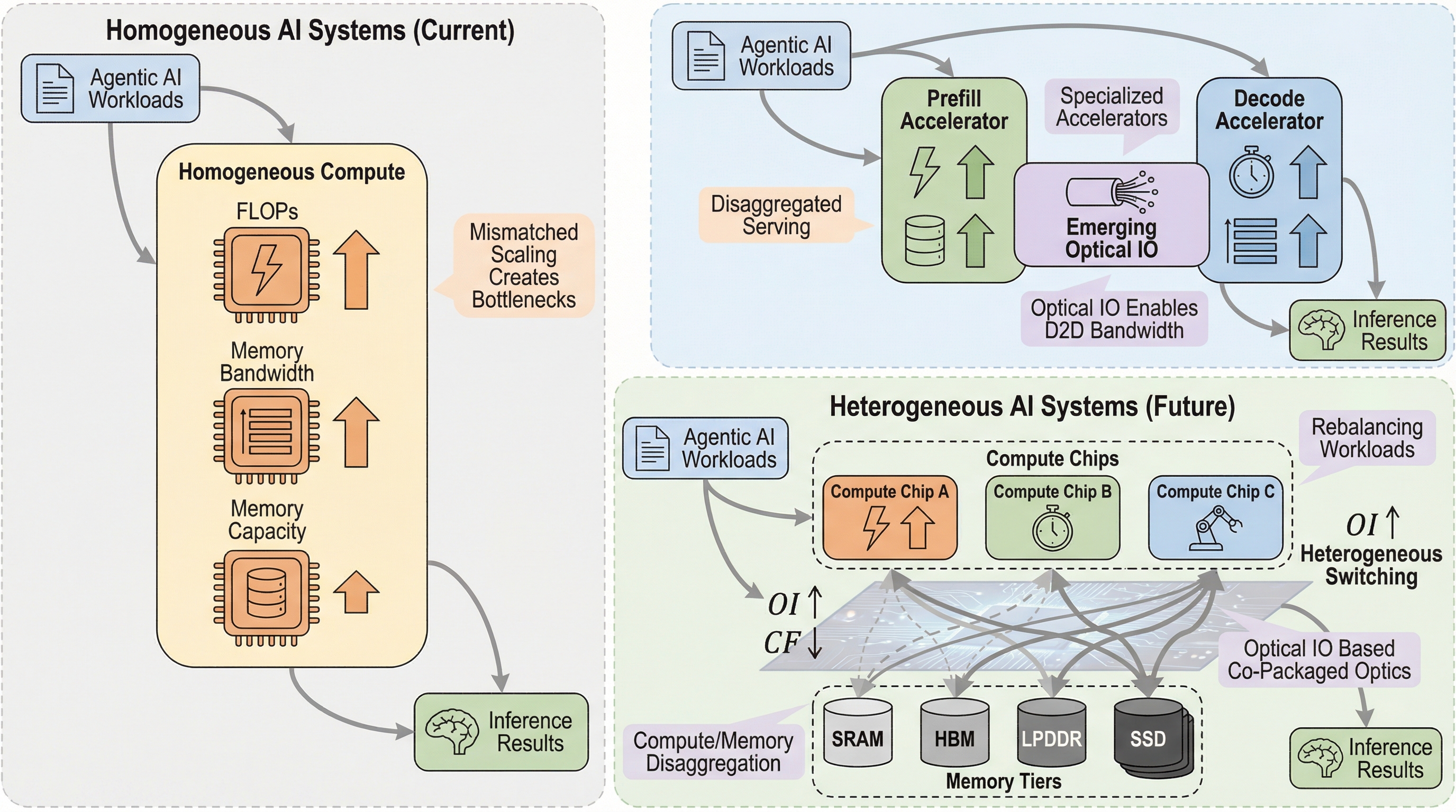 AIエージェントの普及により推論負荷が急増しており、従来のGPU中心の均一なインフラではメモリ帯域幅と容量の限界(メモリの壁)に直面するため、計算・ネットワーク・メモリの全域にわたるシステムレベルの異種(ヘテロジニアス)構成への移行が不可欠である。 本論文は、演算強度(OI)と容量フットプリント(CF)という2つの指標を定義し、チャットボットやコーディング、コンピュータ操作といった異なるエージェントの特性を分析することで、既存のルーフラインモデルでは捉えきれなかったメモリ容量の制約が推論効率を著しく低下させている実態を明らかにした。 解決策として、プリフィル(入力処理)とデコード(生成)の分離、光インターコネクトによる計算とメモリの分散配置、およびハードウェアとモデルの共同設計を提案しており、これにより多様なエージェントのワークロードに対して柔軟かつ高効率なスケーリングを可能にする次世代のAIデータセンター像を提示している。