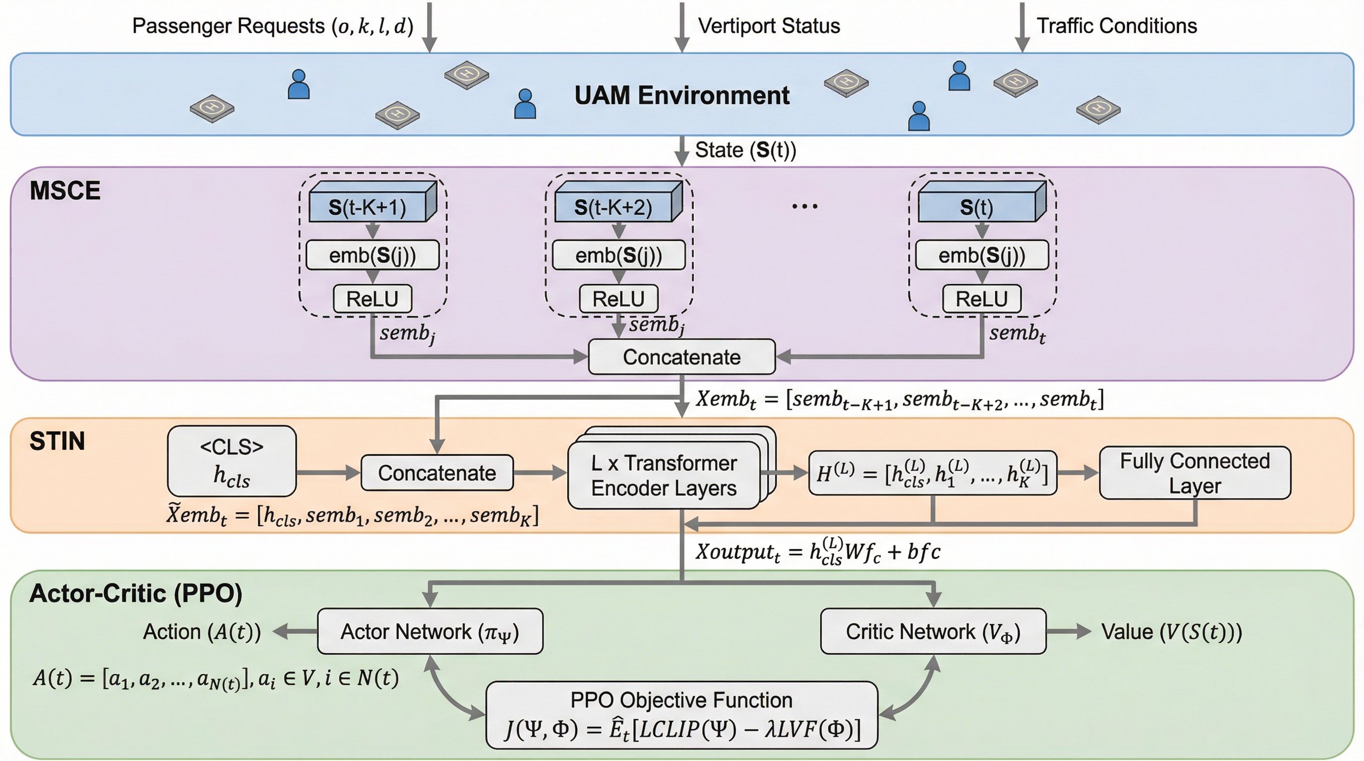都市部の深刻な交通渋滞を解消するため、電動垂直離着陸機(eVTOL)と地上交通を統合管理し、深層強化学習とV2X通信を活用して乗客ごとに最適な離着陸場(バーティポート)を動的に割り当てる「UAGMC」フレームワークを提案しました。 このシステムは、マルチソース・コンテキスト・エンベディング(MSCE)と時空間統合ネットワーク(STIN)を導入することで、リアルタイムの混雑状況や各施設の処理能力を高度に分析し、地上と空を跨ぐドア・ツー・ドアの移動経路を最適化する仕組みを構築しています。 シミュレーションによる検証の結果、従来の比例配分方式と比較して平均旅行時間を34%削減することに成功し、特定の施設への集中を避ける混雑回避型の意思決定が、将来のスマートシティにおけるマルチモーダル輸送の効率を劇的な向上させることを実証しました。