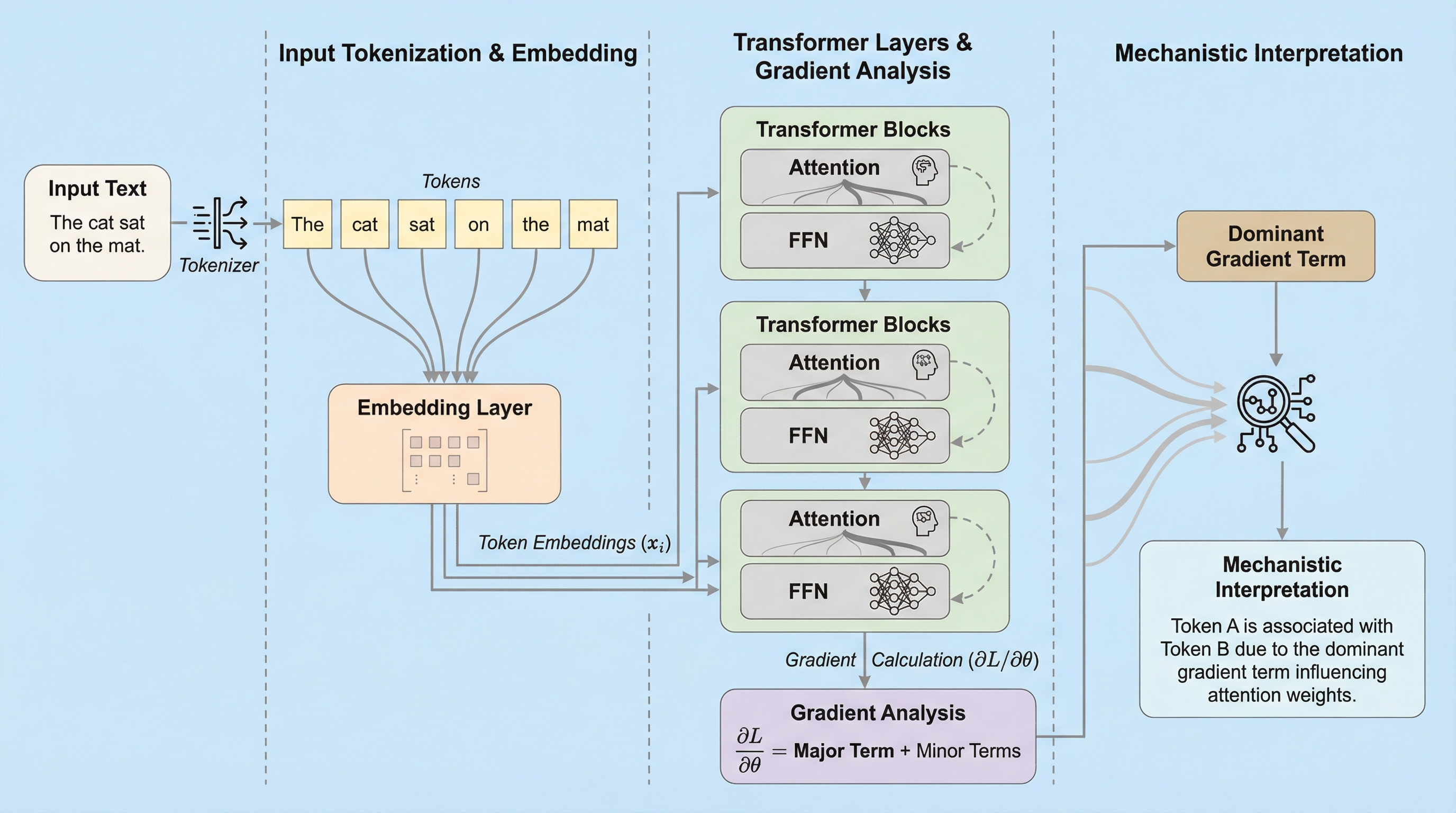 本研究の核心的な提案は、トランスフォーマーの訓練ダイナミクスを「勾配の主要項」の展開を通じて分析し、重み行列を解釈可能な数式として導出したことである。トランスフォーマーは訓練の非常に早い段階で、意味関係の把握や推論能力の基礎となる構造を獲得することが知られている。この初期段階においては、勾配の更新が閉形式で近似可能であり、高次の補正項が蓄積する前のパラメータ更新を支配的に説明できるという特性がある。この分析により、学習された重み行列(出力行列、値行列、クエリ・キー行列、位置エンコーディング)が、コーパスの統計を反映した3つの基底関数の単純な組み合わせとして表現できることが明らかになった。 第一の基底関数は「バイグラム・マッピング」であり、これは次トークンの直接的な依存関係を捉える。第二は「トークン互換性マッピング」であり、類義語や共通の文法役割を持つトークン間の機能的な類似性を反映する。…