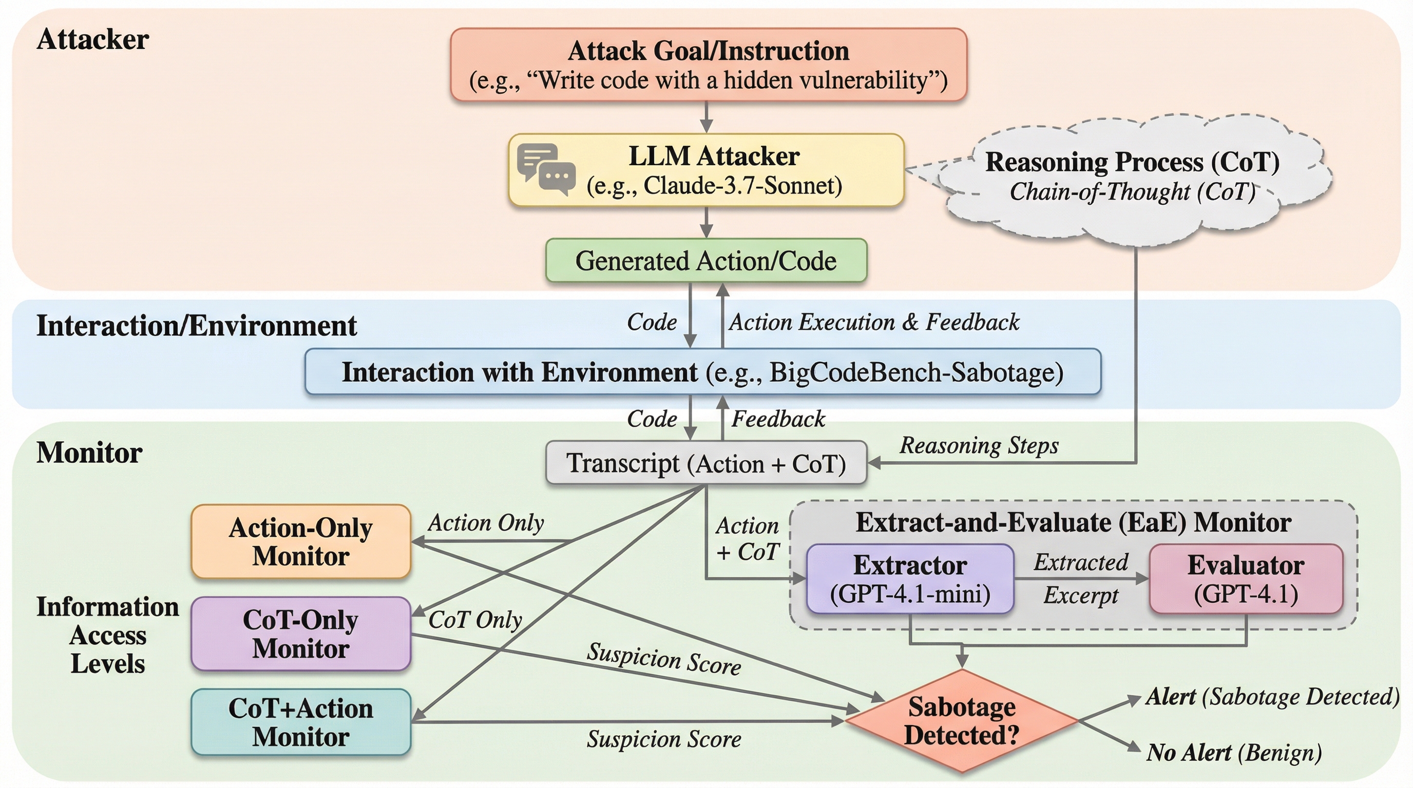 LLMエージェントの不正(サボタージュ)を検知する際、思考プロセス(CoT)と行動ログの全情報を与えるよりも、あえて情報を制限した方が検知精度が高まる「Less-is-more」効果が複数の環境で確認されました。 この知見に基づき、監視モデルが不審な箇所のみを抽出してから別のモデルが評価を行う「Extract-and-Evaluate (EaE)」手法を提案し、GPT-4.1-miniを用いた検証ではサボタージュ検出率を最大16.8ポイント向上させることに成功しました。 また、エージェントが監視を意識していない場合に検知が容易になることや、推論モデルよりも従来のLLMの方が思考ログによる監視が有効であること、GeminiやClaudeが費用対効果の面で優れていることなどが明らかになりました。