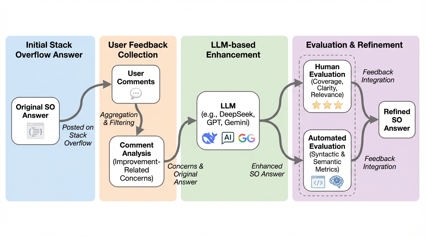 ソフトウェア開発において、Stack Overflowのような技術Q&Aプラットフォームは、開発者がコード生成やデバッグ、最適化を行う上での不可欠な知識源となっているが、投稿された回答が常に最新かつ正確であるとは限らない。 ユーザーはコメントを通じて、コードの誤りや非効率なロジック、あるいはセキュリティ上の欠陥を頻繁に指摘しているが、技術の進歩は速く、かつての正解が現在では動作しない「陳腐化」の問題も頻発している。 先行研究によれば、こうした改善につながる実用的なフィードバックの約3分の1が、時間や専門知識、あるいは視認性の制約によって未対応のまま放置されている。 放置された回答は、それを利用する開発者のプロジェクトにバグや脆弱性を伝播させるリスクがあり、ソフトウェア全体の品質を損なう要因となる。 さらに、プラットフォームのインターフェース構造にも問題があり、デフォルトでは一部のコメントしか表示されないため、重要な提案が見逃されやすい。 既存の自動化手法では、コードの断片のみを更新する試みはあったが、解説文の修正や複数のコメントの統合、質問の文脈の考慮が不十分であった。…