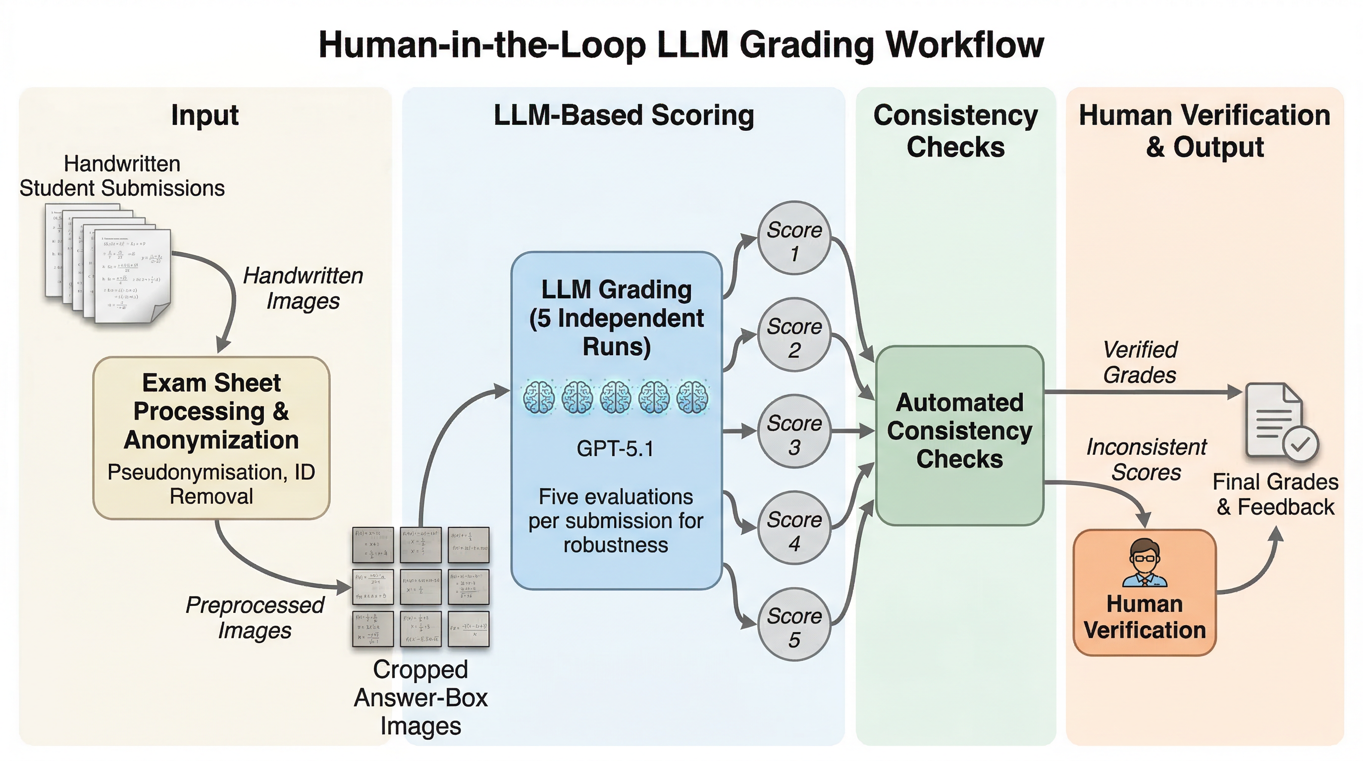 提案の核は、手書き数学答案のための end-to-end な LLM支援採点ワークフローです。単に答案画像をモデルに投げて点数を返させるのではなく、採点の前準備から後処理まで含めた運用手順全体を設計しています。具体的には、(1) 模範解答の作成、(2) 詳細な rubric 形式の grading key の作成、(3) スキャン、OCR、匿名化、LLMによる複数回採点、整合性チェック、そして人間の最終確認、という流れです。