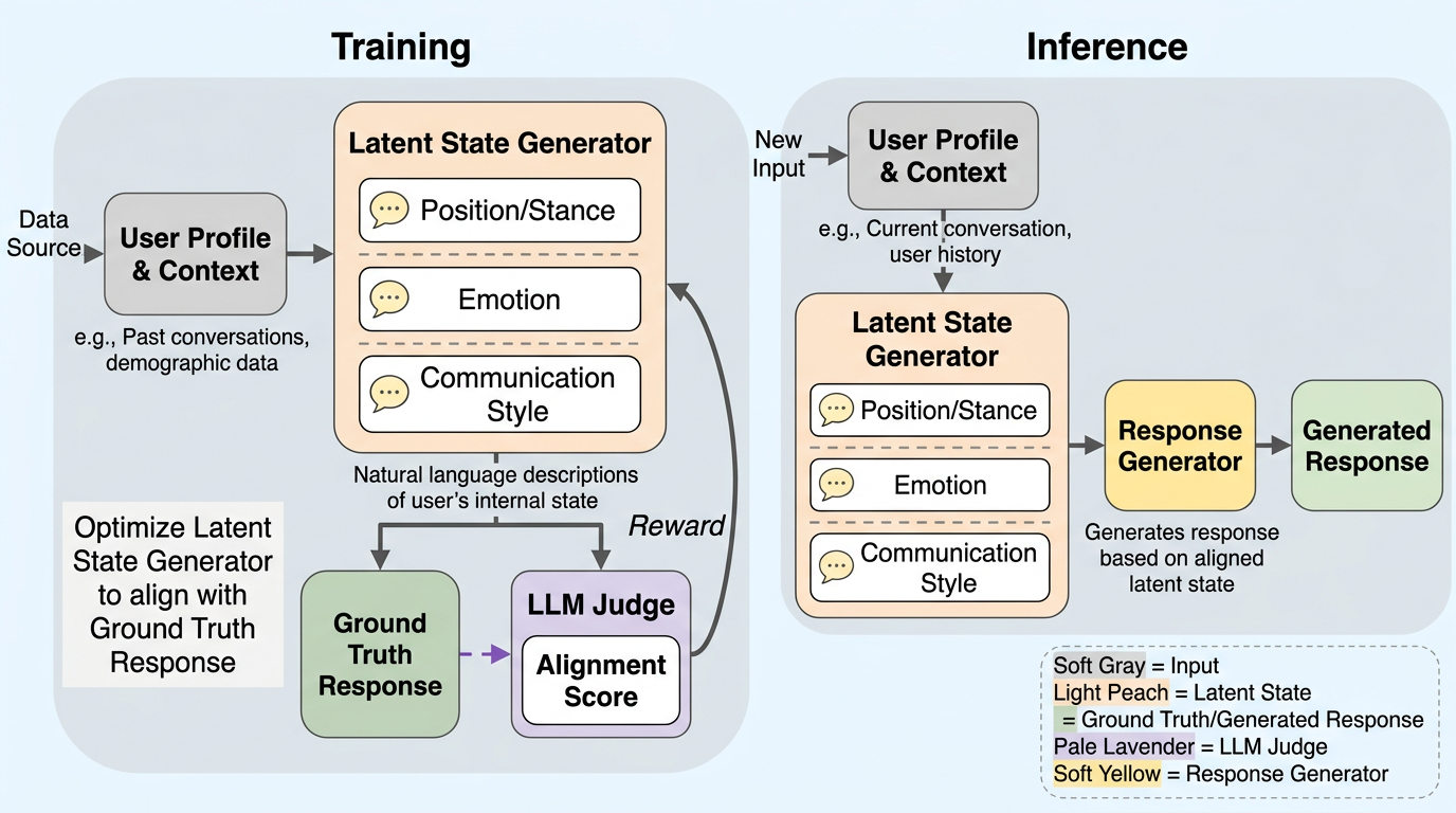 ここで面白いのは、潜在状態を単なる隠れベクトルではなく、自然言語として扱っている点です。これにより、モデルが「何を考えてその応答に至ったのか」を、人間がある程度解釈可能な形で中間表現に持ち込めます。つまり HumanLM は、ユーザーシミュレーションをブラックボックスな模倣問題としてではなく、状態整合という説明可能な学習課題に組み替えようとしているわけです。