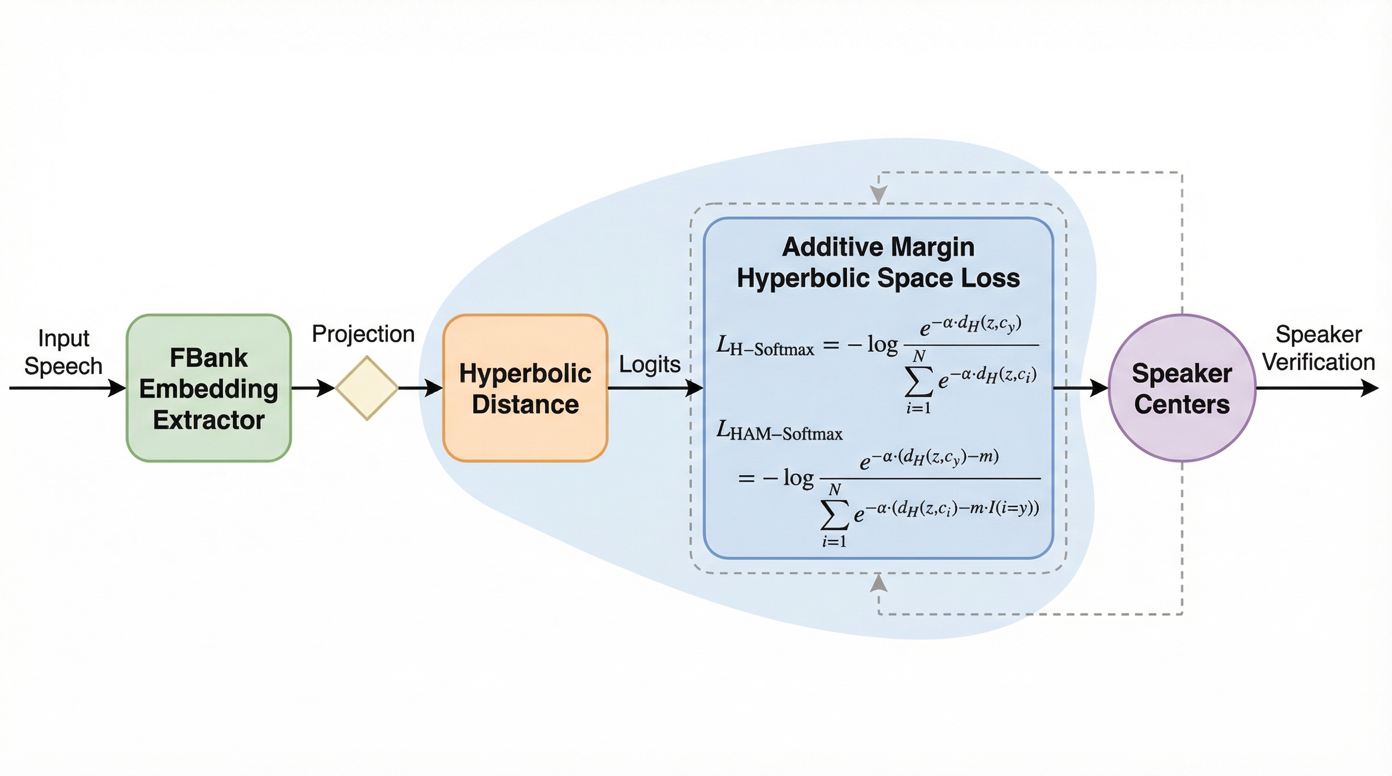 話者照合(SV)は、与えられた音声セグメントが特定の対象話者のものであるかどうかを判断する技術であり、深層学習の発展に伴い、ニューラルネットワークを用いた話者埋め込み学習が主流となっている。これまでの研究では、AM-SoftmaxやAAM-Softmaxといったマージンに基づく損失関数が導入され、クラス内の変動を抑えつつクラス間の距離を広げることで、識別能力の高い埋め込み表現の獲得が試みられてきた。しかし、これらの手法の多くはユークリッド空間を前提としてモデル化されているが、現実世界における話者の特徴は、基本周波数やフォルマント構造、韻律といった要素が複雑に絡み合う木構造のような階層的な情報を含んでいる。ユークリッド空間は平坦な幾何学的性質を持つため、このような指数関数的に広がる階層的なデータ分布を十分に表現する能力が不足しており、話者埋め込みの分離性や汎化性能を制限する要因となっている。 一方で、負の曲率を持つ双曲空間は、幾何学的な特性により、有限の領域内に指数関数的に増加するデータ点を収容できるという特徴を持っている。…